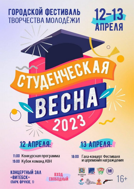 poster stud vesna12 апреля стартует самый грандиозный фестиваль творчества среди университетов Витебска: «Студенческая весна 2023»! 5 высших учебных заведений северной столицы. Более 500 участников. Студенты будут демонстрировать свои таланты в хореографии, вокале, театральном искусстве и других областях. Определим самых талантливых, весёлых и находчивых. Ждём тебя 12-13 апреля в концертном зале "Витебск"! Молодежь Витебска. Твоя эра быть ярким!