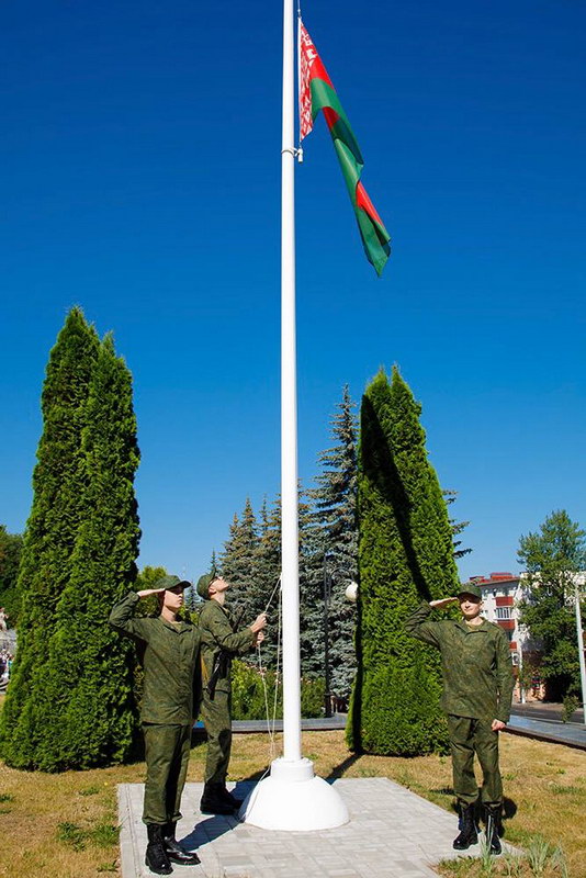 Праздничная церемония началась с поднятия Государственного флага Республики Беларусь. Сделать это было доверено отличникам учебы Даниилу Макухину (ЛФ), Илье Ногачу (ФФ) и Вадиму Палько (СтФ).