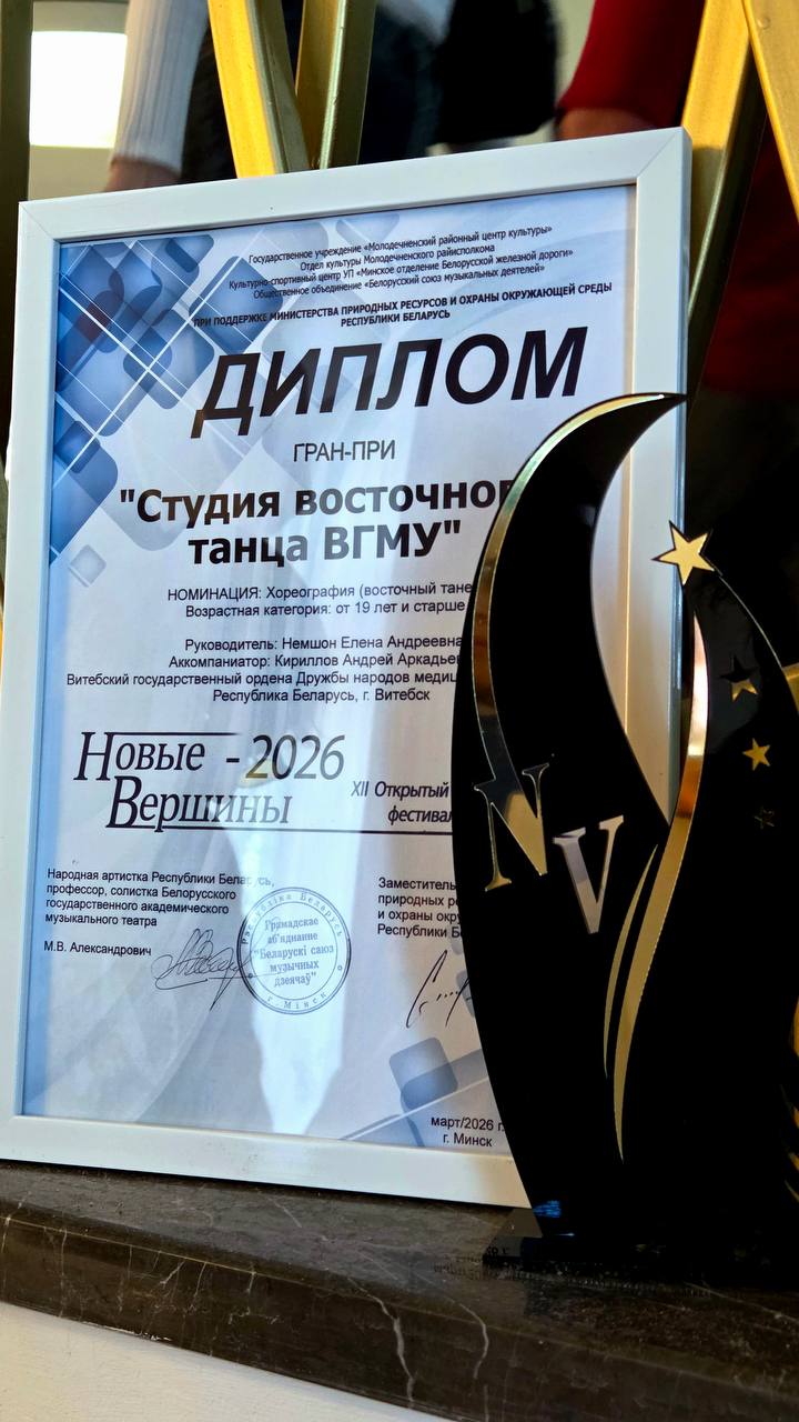 22 марта 2026 года в Минске на сцене XII Открытого фестиваля-конкурса «Новые вершины — 2026» свой звездный час встретил коллектив, который всего три года назад начинал с репетиций в стенах родного вуза. Студия восточного танца ВГМУ, руководителем которой является студентка 5 курса лечебного факультета Елена Немшон, не просто выступила достойно — она покорила жюри и получила высшую награду состязания.