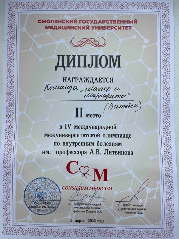 Команда студентов лаборатории профессионального мастерства ВОП «Мастер и Маргариты» приняла участие в IV международной олимпиаде по внутренним болезням "CONSILIUMMEDICUM" им. профессора А.В. Литвинова, проходившей 21 апреля в Смоленске.