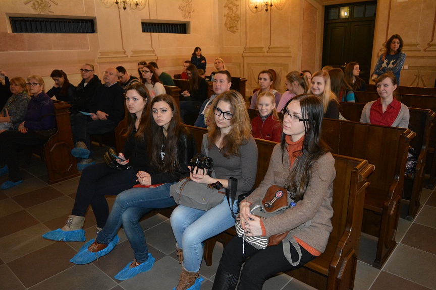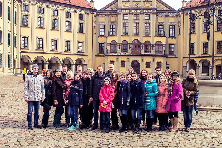 В завершении «мирского этапа» нашего тура руководитель группы провела экскурсию по Рыночной площади, рассказав нам историю о веротерпимости и взаимопонимании. Эта история оказалась неслучайной. Ведь именно здесь, на территории Рыночной площади, в тесном соседстве располагаются православный храм (Троицкая церковь ретроспективно-русского стиля), католический костел (Святого Николая, возведенный в камне в начале XVII века) и иудейская синагога.