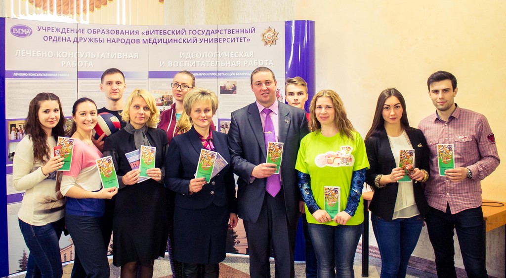 15 апреля 2015 года в УО «Витебский государственный ордена Дружбы народов медицинский университет» профком студентов совместно с ПО ОО «БРСМ» и отделом по воспитательной работе с молодежью организовали и провели акцию «Территория ВГМУ – территория здоровья и успеха». Ее целью стало формирование культуры здорового образа жизни, направленного на борьбу с вредными привычками, противодействие употреблению студентами наркотических и психотропных веществ, а также пропаганда активной и здоровой жизненной позиции среди студентов и сотрудников УО «ВГМУ».