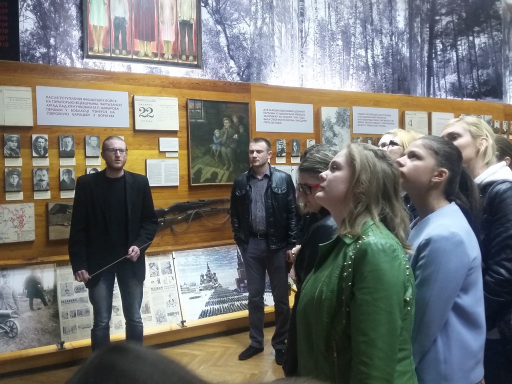 В музее очень интересно и увлекательно рассказали про жизнь и заслуги Миная Филипповича Шмырева. Показали короткометражный документальный фильм «Бацька Минай», который ни одного из присутствующих студентов не оставил равнодушным. В заключении экскурсии студенты смогли посетить землянки, которые строились во времена Великой Отечественной войны, и сфотографироваться со знаменитым ЗИС-3 образца 1942 года в парке музея.