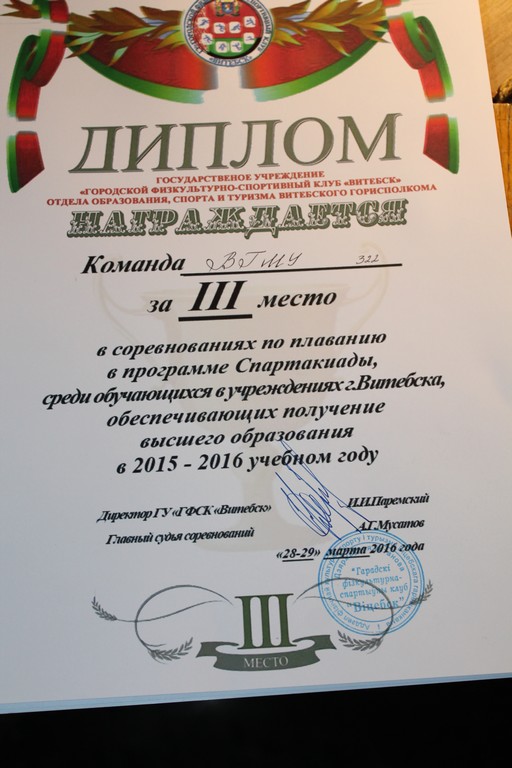 Сборная команда университета в соревнованиях по плаванию в программе Спартакиады вузов г. Витебска, заняла 3-е место.