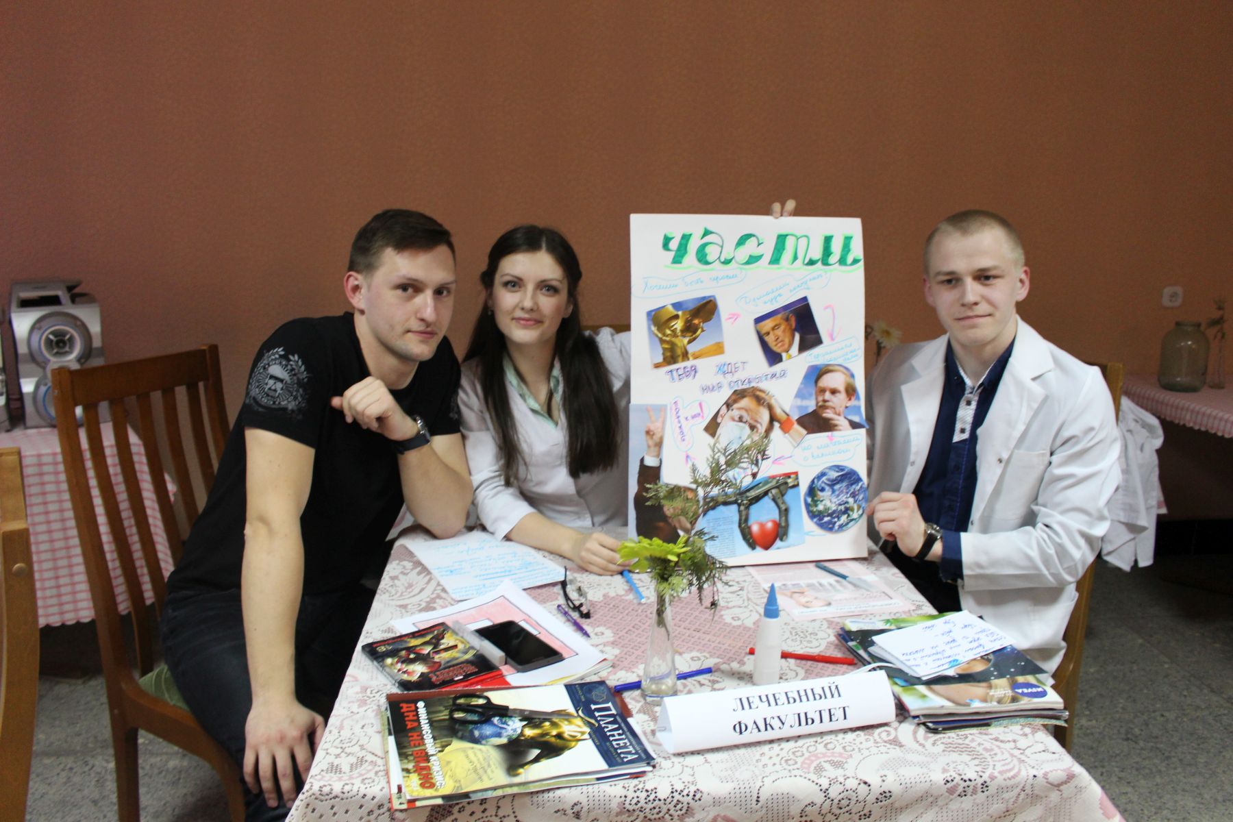 18.04.2016 в стенах 5-го общежития был проведен диспут «Три части целого», посвященный битве факультетов! В нем приняли участие замечательные команды лечебного факультета (Колесник Андрей, Лещенко Алина, Сарма Илья), фармацевтического факультета (Левонюк Екатерина, Шниткова Виктория, Прокопчик Елена) и стоматологического факультета (Курс Евгения, Зубович Николай, Пипирайте Гинтаре). Командам было предложено 4 конкурса.