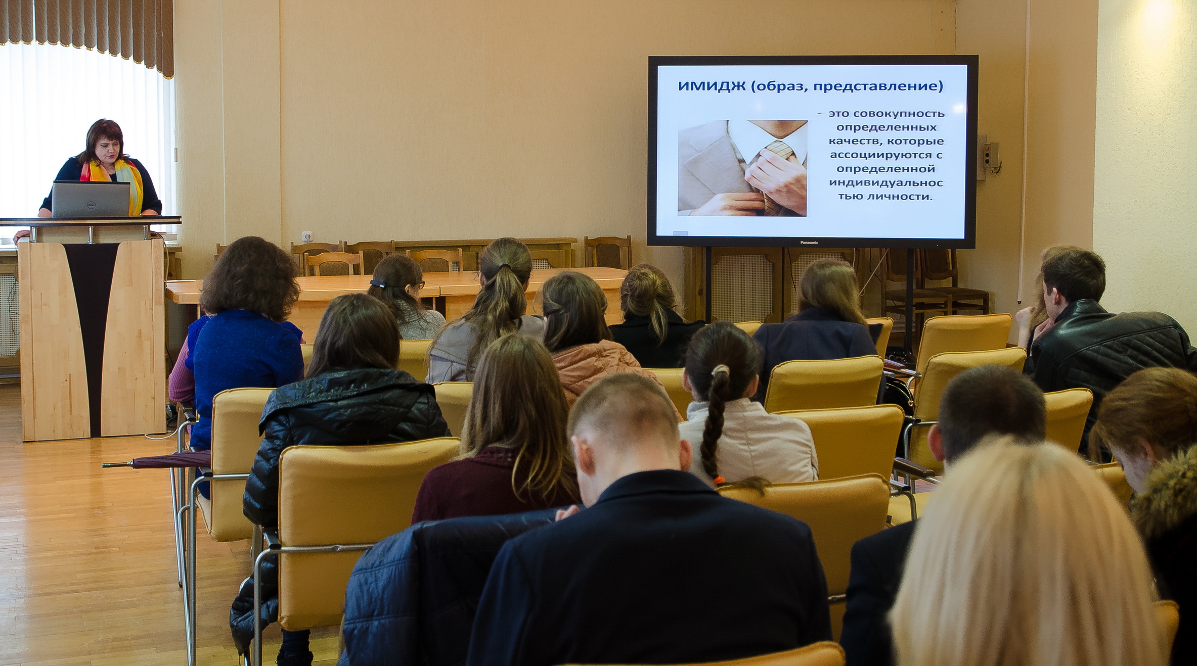 В следующей части заседания Алферова Марина Владимировна (ст. преподаватель кафедры ОЗЗ) выступила с докладом на тему «Социальное управление и основы менеджмента. Имидж руководителя», в котором разобрала все слагаемые успешного имиджа лидера.