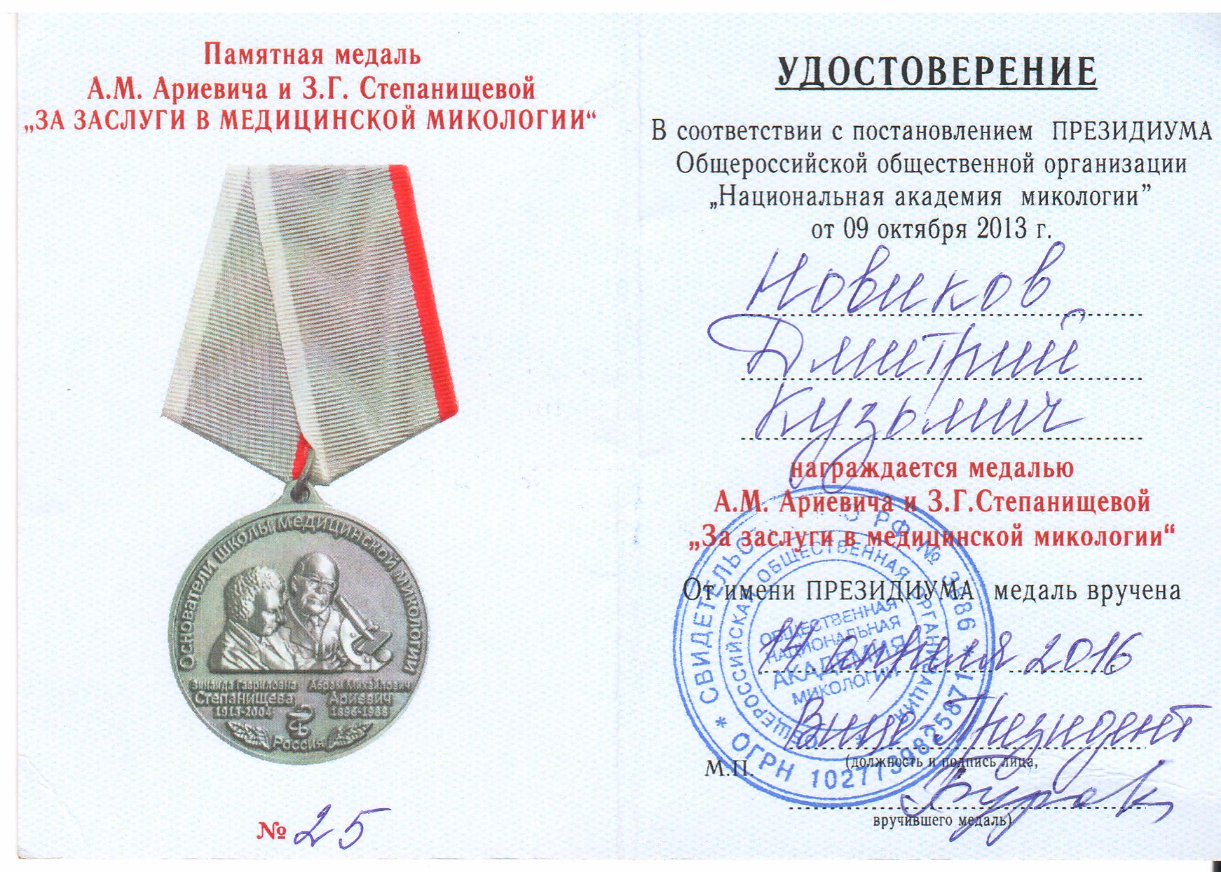 В соответствии с постановлением Президиума Национальной академии микологии профессор Новиков Дмитрий Кузьмич награжден медалью «За заслуги в медицинской микологии» за разработку методов диагностики и раскрытие механизмов патогенеза микогенной аллергии.