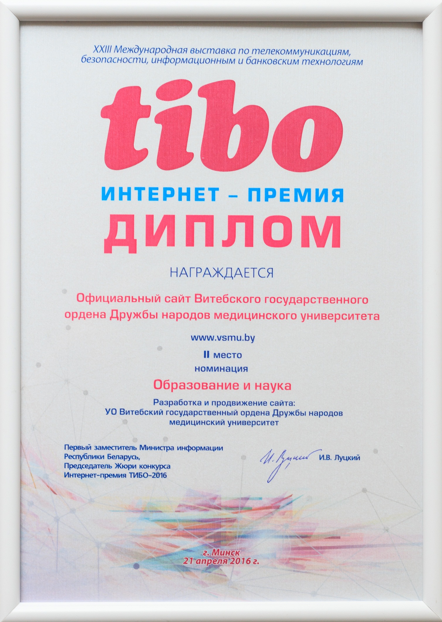 В номинации «Образование и наука» за места на пьедестале боролись 47 проектов. Официальный сайт УО «Витебский государственный ордена Дружбы народов медицинский университет» vsmu.by был удостоен второго места не только в качестве владельца ресурса, но и как его разработчик. Оба диплома начальнику отдела дистанционного обучения ВГМУ Глебу Синькову вручил первый заместитель министра образования Беларуси Вадим Богуш. Первое место в этой номинации занял интернет-портал Белорусского государственного университета. Третье место не присуждалось.