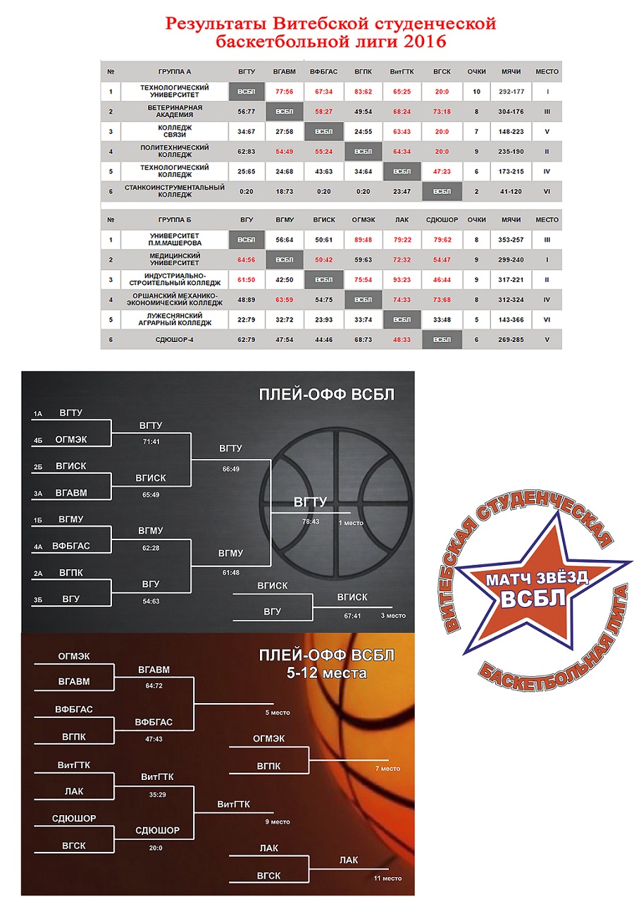 19 мая (четверг) в 17.30 в большом спортзале УО «Витебского государственного ордена Дружбы народов медицинский университет» (пр-т Фрунзе 27/2) состоится первый в истории Матч Звёзд Витебской баскетбольной студенческой лиги (ВБСЛ). Лучшие игроки Чемпионата, представляющие свои учебные заведения, будут разделены на две команды по принципу сборная ВУЗов против сборной ССУЗов.