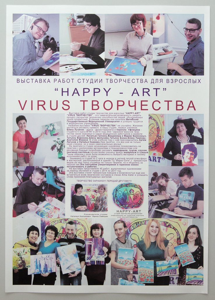 15 февраля в фойе ЛТК, ставшем уже привычным местом для различного рода экспозиций, открылась выставка работ студии творчества для взрослых «HAPPY ART» под остроумным названием «VIRUS ТВОРЧЕСТВА». Эта выставка — отличная возможность увидеть процесс раскрытия творческих способностей людей, объединенных одной профессией. Все представленные авторы в разное время окончили наш университет и успешно трудятся в здравоохранении.