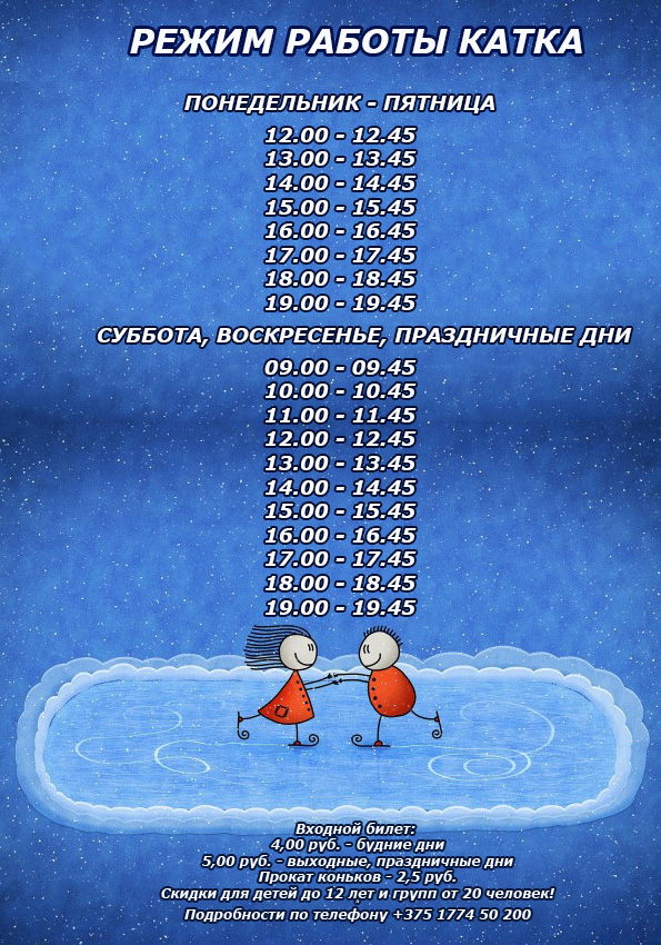 Добрый день! Приглашаем посетить обновленный каток в РУП "Горнолыжный центр "Силичи". Расписание и стоимость сеансов в приложении. Детям до 12 лет скидки!