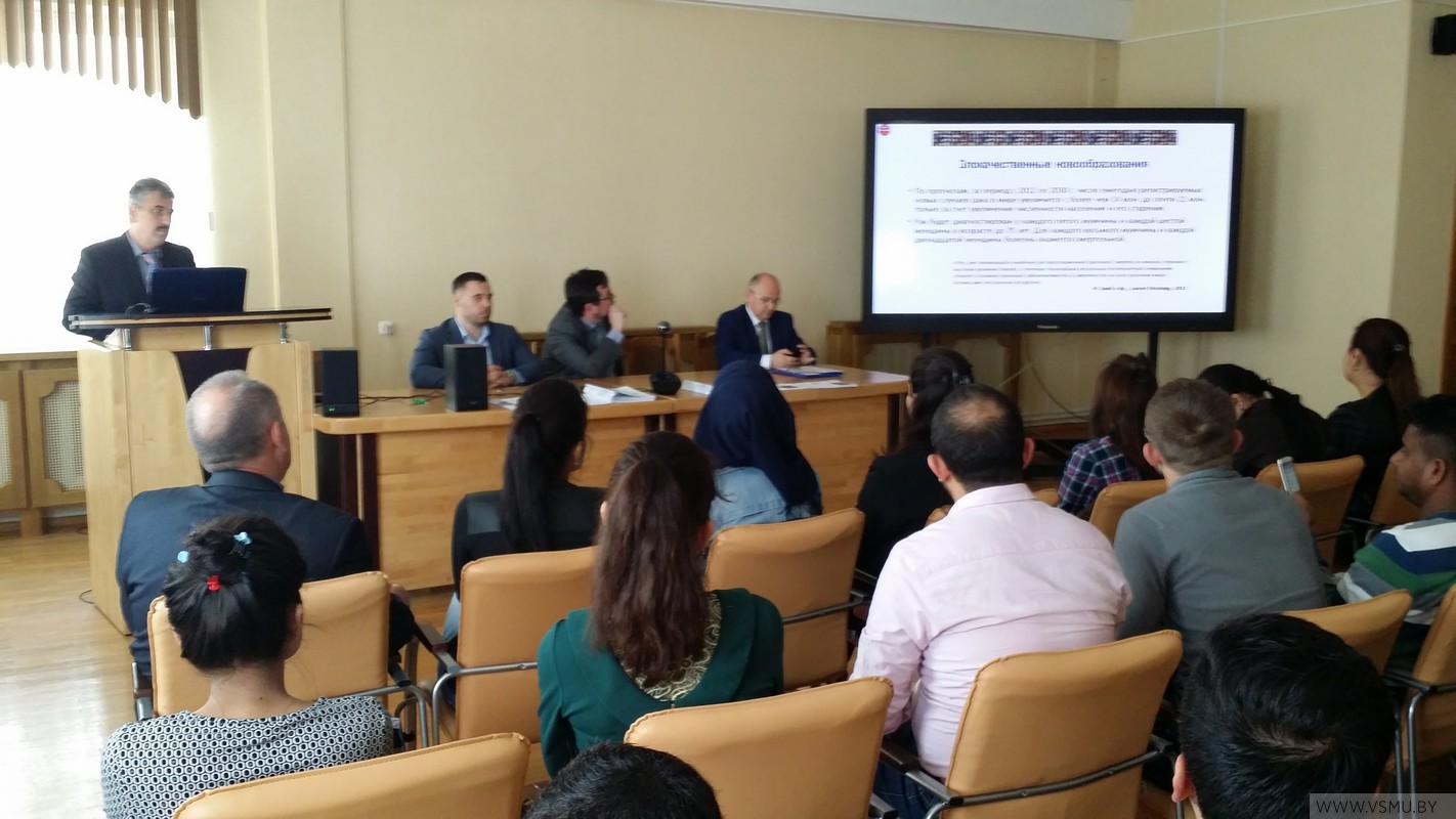 13 июня 2017 г. в ВГМУ состоялась встреча профессорско-преподавательского состава БЕЛМАПО со студентами выпускных курсов и магистрантами из числа иностранных граждан ВГМУ по вопросам подготовки в клинической ординатуре и обучению в аспирантуре. Встреча была организована деканатом ФПИГ при участии отдела дистанционного обучения ВГМУ. На мероприятии, проходившем в конференц-зале морфологического корпуса присутствовали около 50 студентов лечебного и стоматологического факультета.