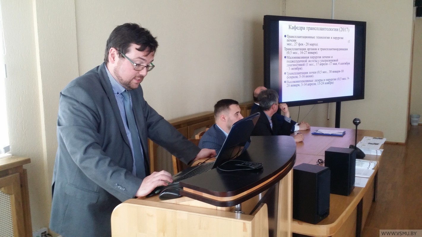 Затем выступили декан факультета общественного здоровья и здравоохранения доцент А.Н. Чуканов, доцент кафедры челюстно-лицевой хирургии Д.А. Гричанюк, доцент кафедры трансплантологии А.А. Глинник, заведующий кафедрой онкологии доцент А.Г. Жуковец. Все выступления произвели сильное впечатление на аудиторию за счёт яркой подачи материала и наличию в них интересной информации о современных методах диагностики и лечения, а так же организации обучения в БЕЛМАПО.
