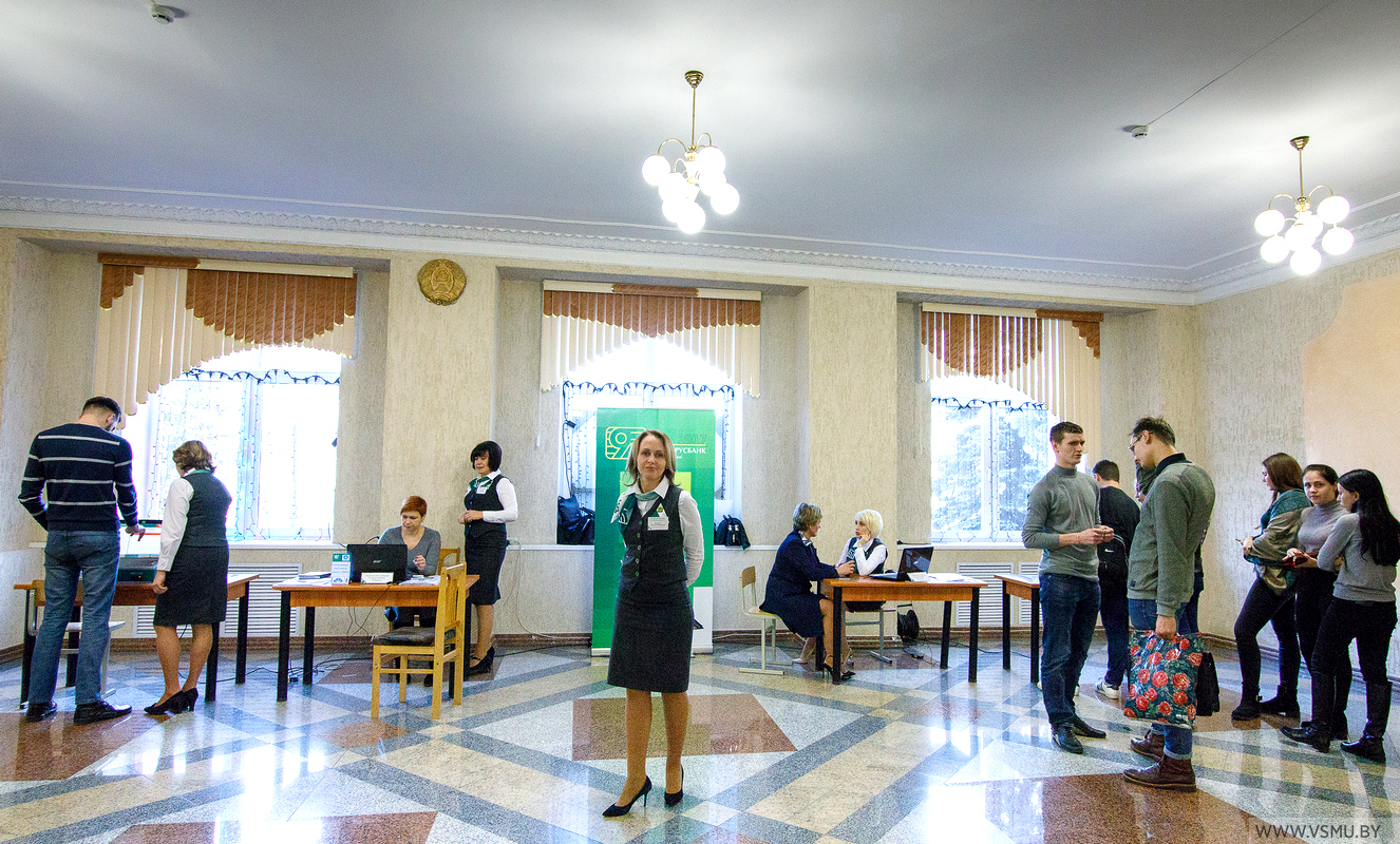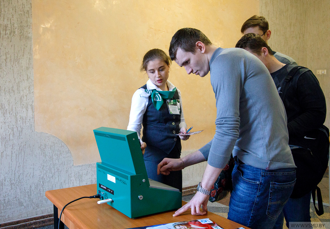 С утра в фойе первого и второго этажей главного учебного корпуса ВГМУ были установлены инфокиоски «Беларусбанка», точки интернет-доступа к дистанционным банковским услугам, работали консультанты в фирменной униформе. Студенты и сотрудники университета знакомились с новыми видами банковских услуг, получали квалифицированные ответы на возникающие вопросы, становились участниками лотереи «Беларусбанка».