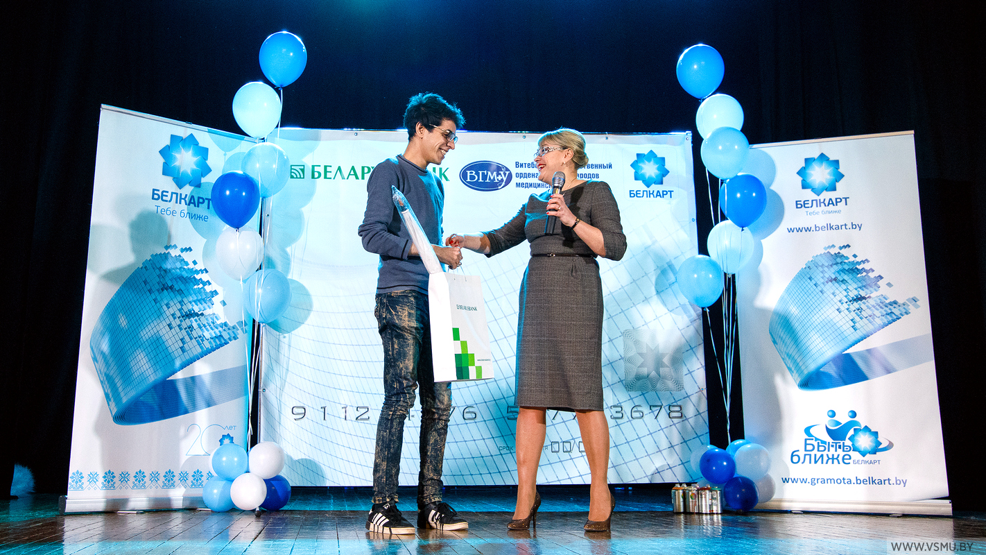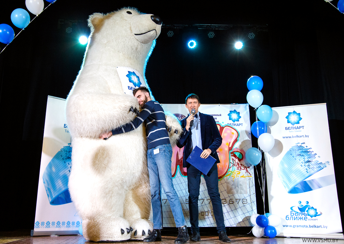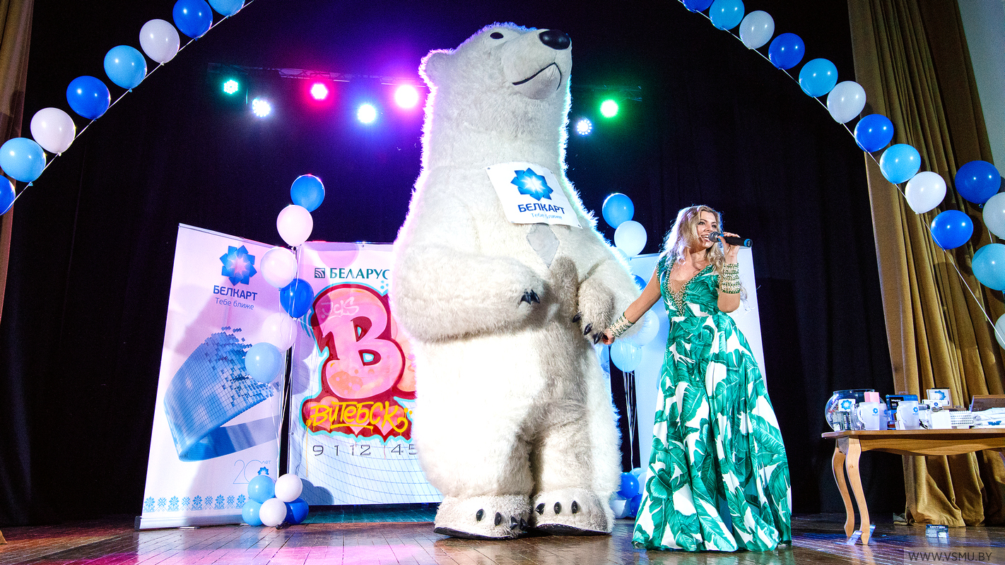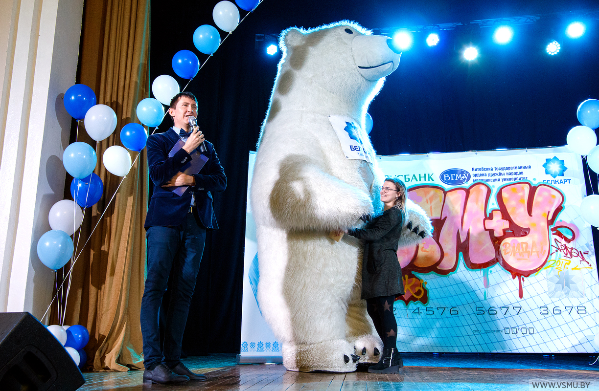 В 15.00 в актовом зале университета началось яркое музыкально-развлекательное шоу, в программе которого были: финансовая викторина, выступление певицы Влады, гигантский танцующий медведь Аэро, розыгрыш призов лотереи банка и многое-многое другое. Присутствующие узнали о преимуществах внутригосударственной системы платежей посредством карточек «Белкарт». Наиболее активные пользователи этой системы среди наших иностранных студентов получили подарки от «Беларусбанка». Было шумно, весело и познавательно.