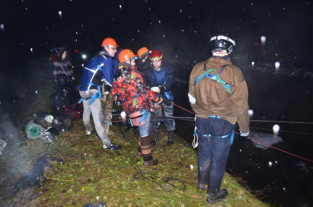 Третий блок. Начало весёлое – транспортировка пострадавшего вверх по склону. Мокрая листва, грязь, сыпучая земля – идеальные спутники, но и они отступают под нашим натиском. Поднялись, закрепили снаряжение, помогли подняться спасателю с пострадавшим, и этап закончен. Собрались, пошли. Вновь переход. И новый пункт – по пути будут контрольные пункты (КП), с которыми надо сделать фото. А это проблематично. Снег, темнота, пар от всех участников – ничего на кадрах не видно. Добрались до следующего этапа. Работа СГ. Канал глубиной 2,5 метра. На дне два пострадавших. Первая команда вытаскивает пострадавшего наверх и производит сердечно-лёгочную реанимацию, а второй необходимо вытащить своего пострадавшего наверх и переправить к первой команде. Ни минуты обсудить действия. Перекрикиваемся через канал. Нашли всё-таки способ. Пока мы проводим СЛР нашему пациенту, вторая команда готовит транспортировку. Сделано. Перевезли пострадавшего, переправили команду. Осталось сдернуть веревки, а скоро время контрольное заканчивается. Эх, судья, ставь штраф за потерю снаряжения! Все же лучше, чем КВ. Собрались, и дальше в дорогу.Ориентирование. В лесу. В темноте. В снегопад. Прелесть. Всё то же контрольное – 1 час. Что нашли из КП – то отметили, и на следующий этап. «Посиделки у костра». Звучит приятно. А ведь это тоже задание – зажечь огонь без спичек или зажигалки, сделать чай, сочинить песню и спеть под самодельный музыкальный инструмент. Наибольшие проблемы были с костром – ну никак не найти чего-нибудь сухого, когда более 8-ми часов льет дождь вперемешку со снегом. Штраф, и в ход идёт уже родная газовая горелка. Получилось. Немного согревшись, продолжаем путь дальше. Работа СГ. Надуть байдарку, соорудить для нее носилки и по лесу километр-полтора нести до озера. Руки в хлам, ноги уже дрожат, но до половины дистанции мы даже не дошли. Вот и озеро. «Молчаливая переправа». Работа для замов. На байдарке с одного берега озера на другой перевезти 2 команды. В байдарке за один раз не более 2-х человек и 2-х рюкзаков, а так же нельзя меняться ролями. Но главное – нельзя говорить, и вообще издавать какие – либо звуки. Лишь условные сигналы фонариками. Поплыли. Холодная водичка сама по себе не вызывает радости, а сидеть в ней – ещё одно испытание. 7 кругов по водной глади в ночи, когда кроме точек от фонариков ничего не видно – испытание для одного человека. Но вот и последний человек на противоположенном берегу, байдарки сдуты, и мы завершаем 3-й блок.