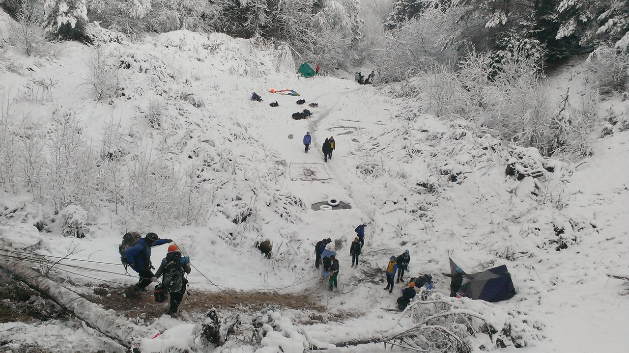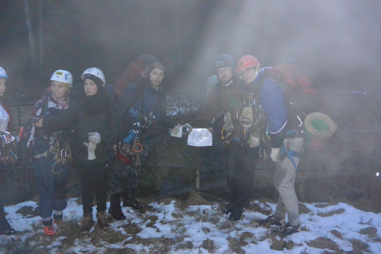 6.00. Подъем и начало завершающего 6-го блока соревнований. Один час на сборку вещей и варку чая. Благо, что костер ещё не успел погаснуть. Ни малейшего желания покидать сухой и теплый спальник, чтобы выйти в сырой и холодный мир леса. За пару часов снегопад прекратился. Нельзя было не восхититься красотой зимней природы в предрассветной тишине. Ели, чьи ветви покрыты белыми шапками снега. Красота. И вновь в дорогу, сборы. Натягивать на себя мокрую, замерзшую вчерашнюю одежду – не самое лучшее начало дня. Вещи собраны, чай распит, тент упакован, и мы можем выдвигаться. Переход длинною в час. Лишь неповторимый пейзаж девственного леса помогал отвлечься от предстоящих нагрузок. Мы добрались до КП, и капитаны пошли на совещание. Есть время подготовиться. Работа СГ, вот только уже по 3-4 команды. Жеребьевка, кому какой этап достанется. Мы «везунчики» - поиск пострадавшего в лесу и транспортировка на самодельных носилках до следующей команды. А время идет. Побежали. Благо, быстро нашли нашу бедолагу. Пока мы оказывали первую медицинскую помощь, другая часть команды нашла палки для носилок. Вяжем. Готово. Теперь создание бутерброда. На носилки коврик, на коврик спальник, в спальник страдальца. Закрепляем веревками для страховки, и выдвигаемся. По сугробам, через кусты и поваленные деревья к цели. Впереди небольшой холмик, а за ним дорога. Напролом. Эх, глупая идея была. Носилки не выдержали – одна из палок сломалась. Ловим пациента, переносим на безопасный участок. Все заново. Готово. Продолжим. Оббегаем болото, густые заросли, и вот мы у подножия горы, где нас ждет уже следующий этап и вторая группа. Задание – подняться по склону с помощью веревки и поднять пострадавшего. Последнее уже не к нам. Рюкзаки на плечи и вверх. 30 метров в гору по снегу, песку, корням и опавшей листве – мы забрались. Заслуженный отдых. А вот и капитан поднялся с носилками. Надо бы их развязать и собрать, чтобы не мешали. Но нет, транспортировка на следующий этап тоже за нами. Ждем. Подняли нашего пострадавшего. По той же системе упаковываем, и на следующий этап. Теперь все наоборот. Необходимо спуститься. И опять мы работаем. Неравномерное распределение обязанностей, но нет времени разбираться. Первым спускаем спасателя с пациентом. Все хорошо, получилось. Наша очередь. Застраховались, спустились, ждем. Вот и последний человек спустился, забираем снаряжение, собираем и финиш. Поисково-спасательные работы закончены. Время двигаться к месту сбора.