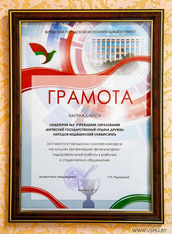 Общежитие № 5 ВГМУ награждено грамотой и ценными призами Витебского городского исполнительного комитета за второе место в смотре-конкурсе на лучшую организацию физкультурно-оздоровительной работы в рабочих и студенческих общежитиях г. Витебска 2017 года среди 30 участников.