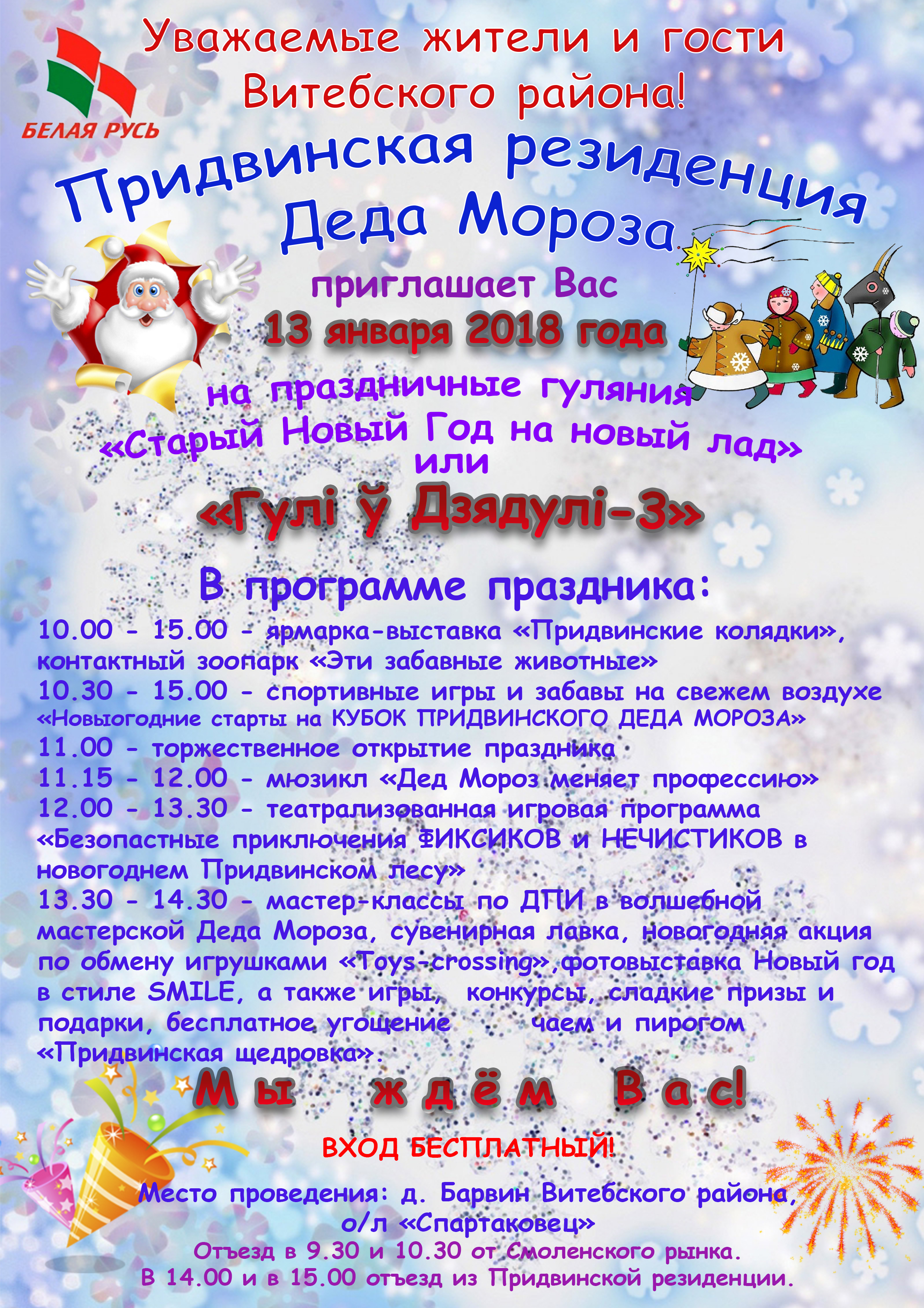 Придвинская резиденция Деда Мороза приглашает Вас 13 января 2018 года на праздничные гуляния "Старый Новый Год на новый лад"