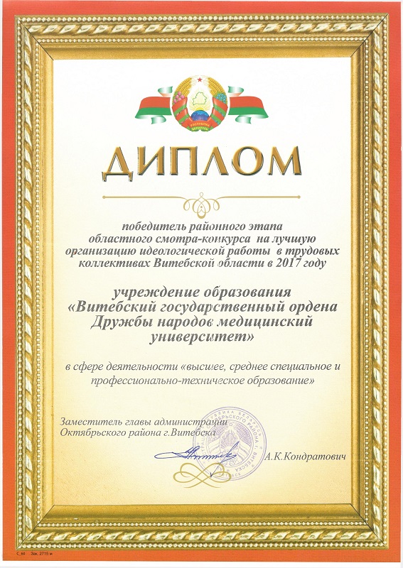 Учреждение образования "Витебский государственный ордена Дружбы народов медицинский университет" стал победителем районного этапа областного смотра-конкурса на лучшую организацию идеологической работы в трудовых коллективах Витебской области в 2017 году.