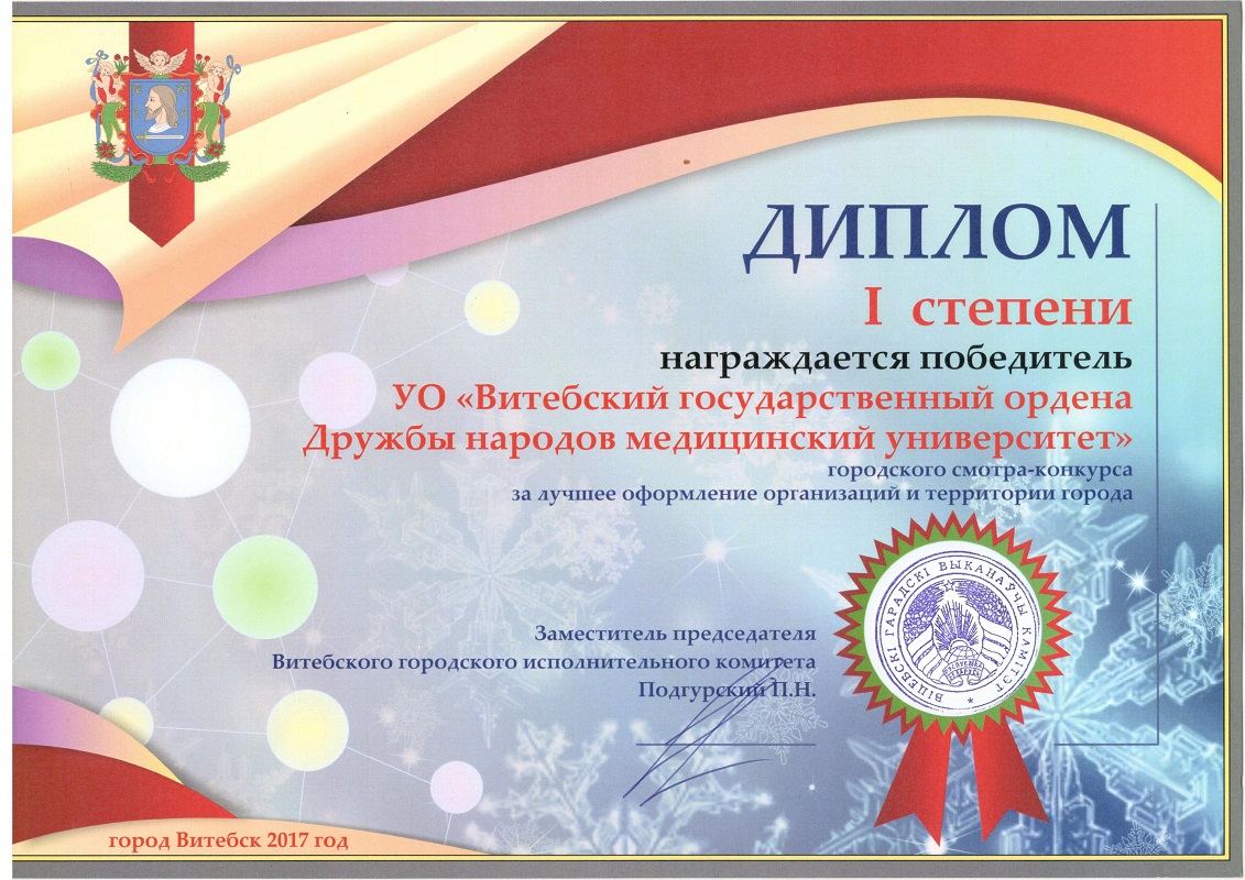 Учреждение образования "Витебский государственный ордена Дружбы народов медицинский университет" награжден дипломом I степени городского смотра-конкурса за лучшее новогоднее оформление организации и территории города.
