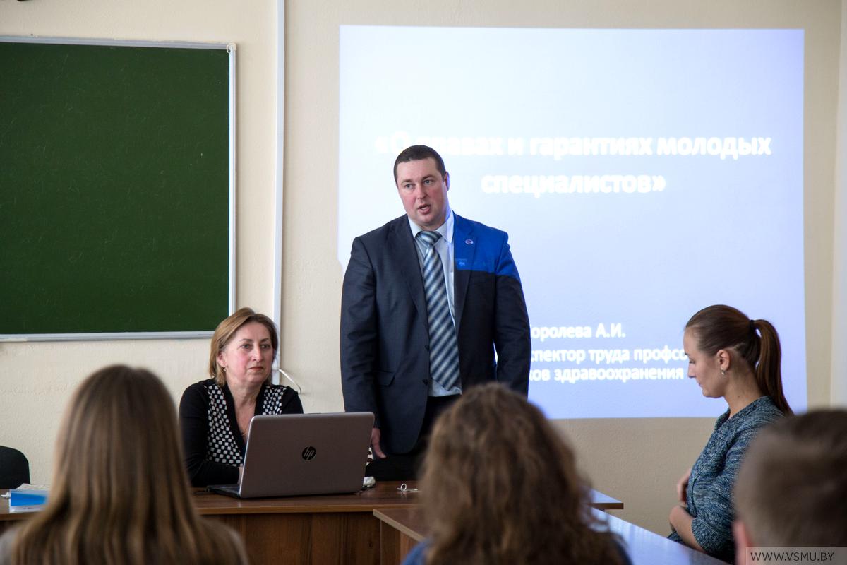 20 марта 2018 года на базе Витебского государственного медицинского университета прошла очередная учёба Школы подготовки профсоюзных молодежных кадров «Стратегический резерв 2020». Темой встречи стала: «Защита прав работающих женщин и молодежи». Для раскрытия этой важной темы в вуз был приглашён правовой инспектор труда Витебского областного комитета Белорусского профсоюза работников здравоохранения по вопросам трудоустройства и оплаты труда молодых специалистов.