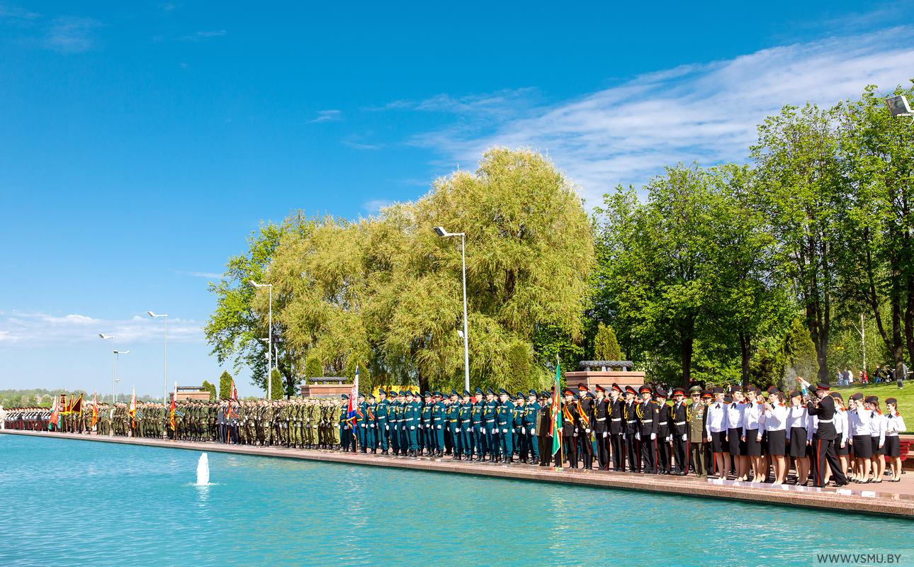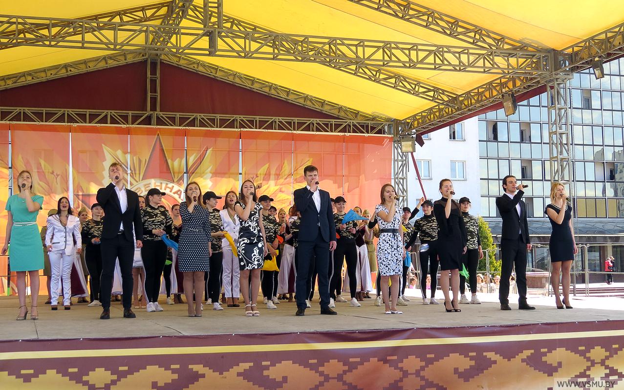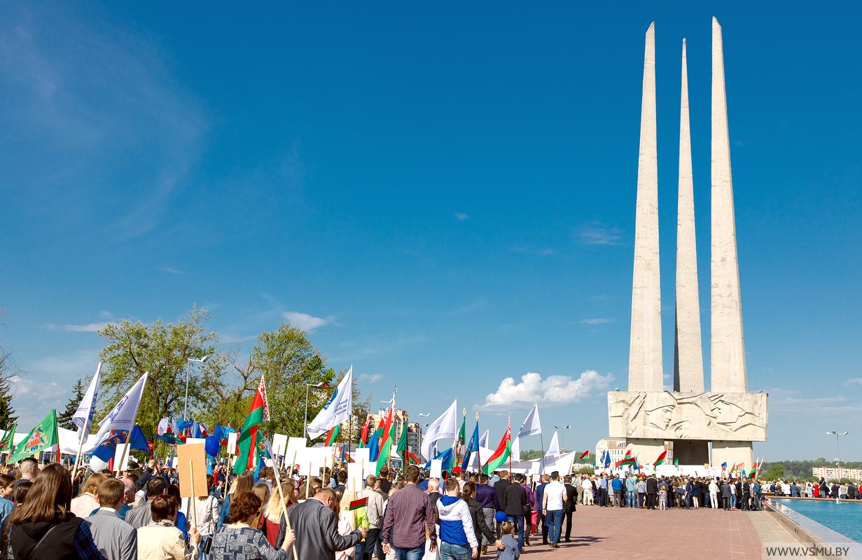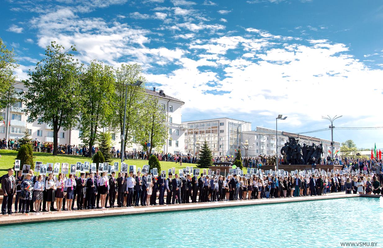 9 Мая сотрудники и студенты университета приняли участие в праздничном шествии и митинге в честь Дня Победы. Солнечный теплый день, ярко расцвеченные флагами, транспарантами и воздушными шарами колонны движущихся по улице Ленина людей, льющаяся из громкоговорителей музыка – всё это создавало праздничное весеннее настроение. На площади Победы у Вечного огня состоялось возложение венков и торжественный митинг, а затем, на концертной площадке выступили представители творческих самодеятельных коллективов Витебска, в числе которых были и студенты нашего университета.
