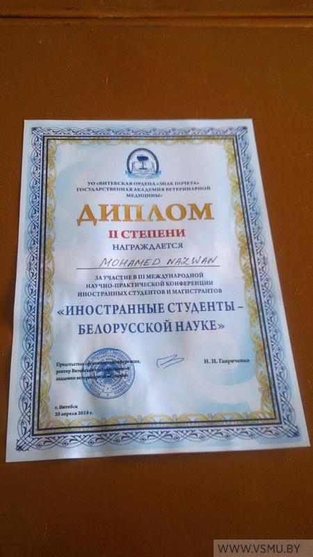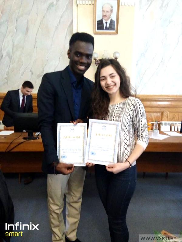 Студент первого курса факультета подготовки иностранных граждан (специальность «фармация») Джохор Элвис Армоне и студентки второго курса фармацевтического факультета Рымашевская Анна и Костючкова Александра представили доклад на тему «Тhe effect of thyroid hormones on the intensity of lipid peroxidation in stress» (научный руководитель: доцент Е.А. Гусакова). В результате представления докладов на пленарном заседании конференции вышеуказанные студенты были удостоены дипломамиI и II степени. Статьи этих студентов и статья Волида Амани, Воробей Полины и Разумовой Александры «Inorganic components of indigenous tooth pastes produced by OJSC «Modum» and tooth pastes produced Colgate-palmolive company» напечатаны в сборнике этой конференции (научный руководитель: профессор З.С. Кунцевич).