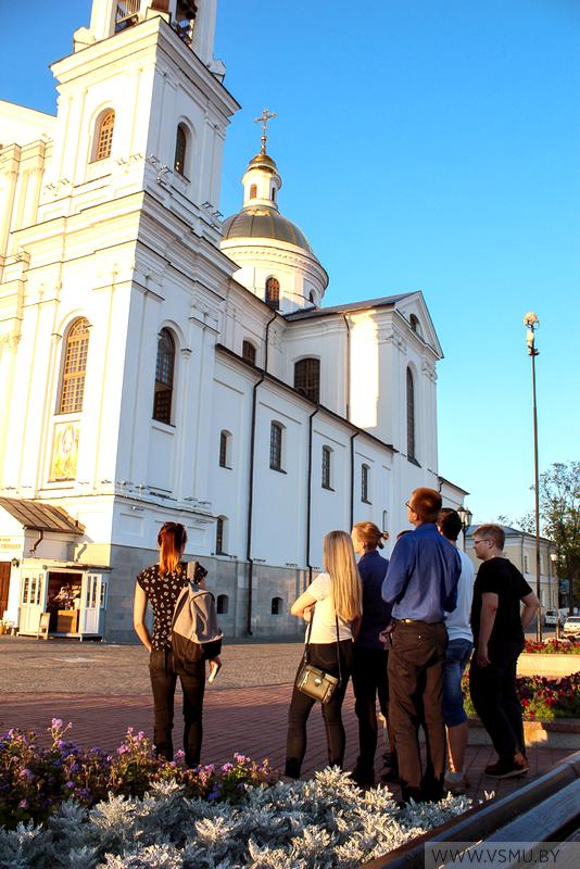 Не осталось без внимания и одно из уникальнейших архитектурных сооружений Беларуси - величественный Свято-Успенский собор, который по праву считается главным символом православного Витебска. Это единственный храм Витебска, нижний ярус которого размещен под землей. Студентам было интересно узнать, что название собора произошло от Успенской горы, на которой он был построен еще в виде простой деревянной церквушки в начале XV века. Также поразил тот факт, что за долгую историю своего существования храму пришлось пережить множество невзгод: он и разрушался, и горел, и был передан во владение униатам, а во времена советской власти на месте тогда уже отстроенного каменного храма был установлен цех завода по производству станков, который вскоре был заброшен и снесен. И только в начале 90-ых годов прошлого века храм начал приобретать сегодняшний современный вид, а полная реконструкция собора завершилась только в 2011 году, в результате храм возродился и стал еще прекрасней. Жители и туристы Витебска всегда с удовольствием приходят в храм, ведь именно здесь можно услышать звон более 20-ти колоколов и насладиться изумительными фресками внутри храма.