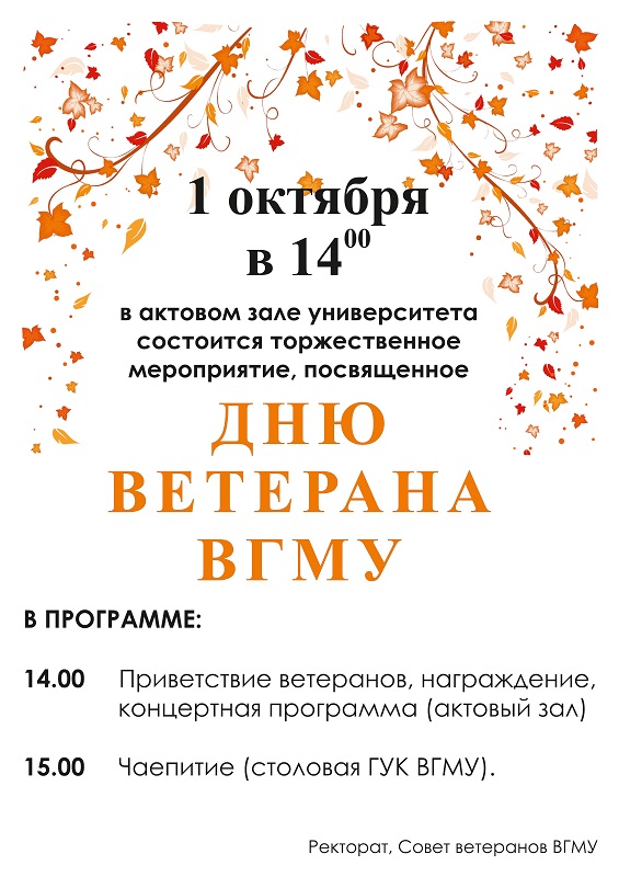 1 октября в 1400 в актовом зале университета состоится торжественное мероприятие, посвященное Дню ветерана ВГМУ.