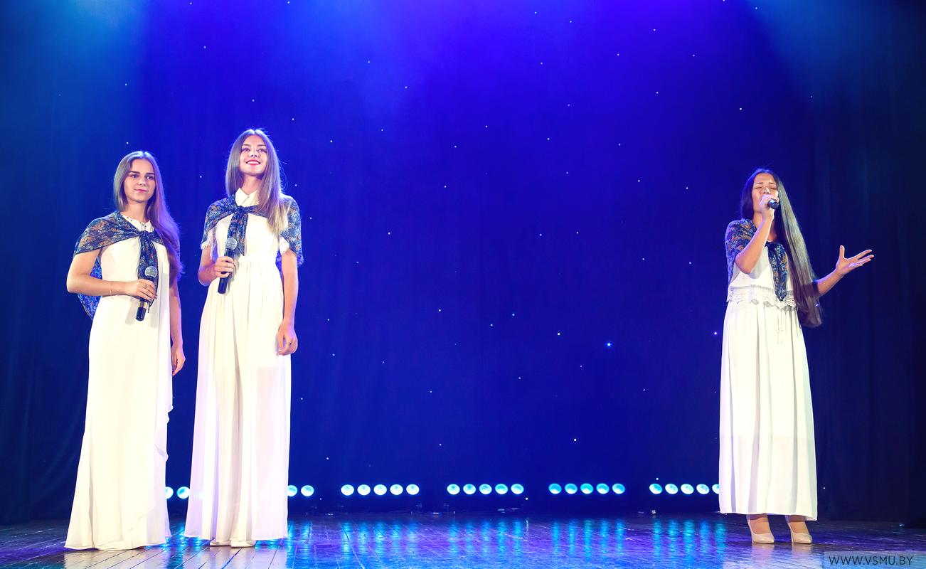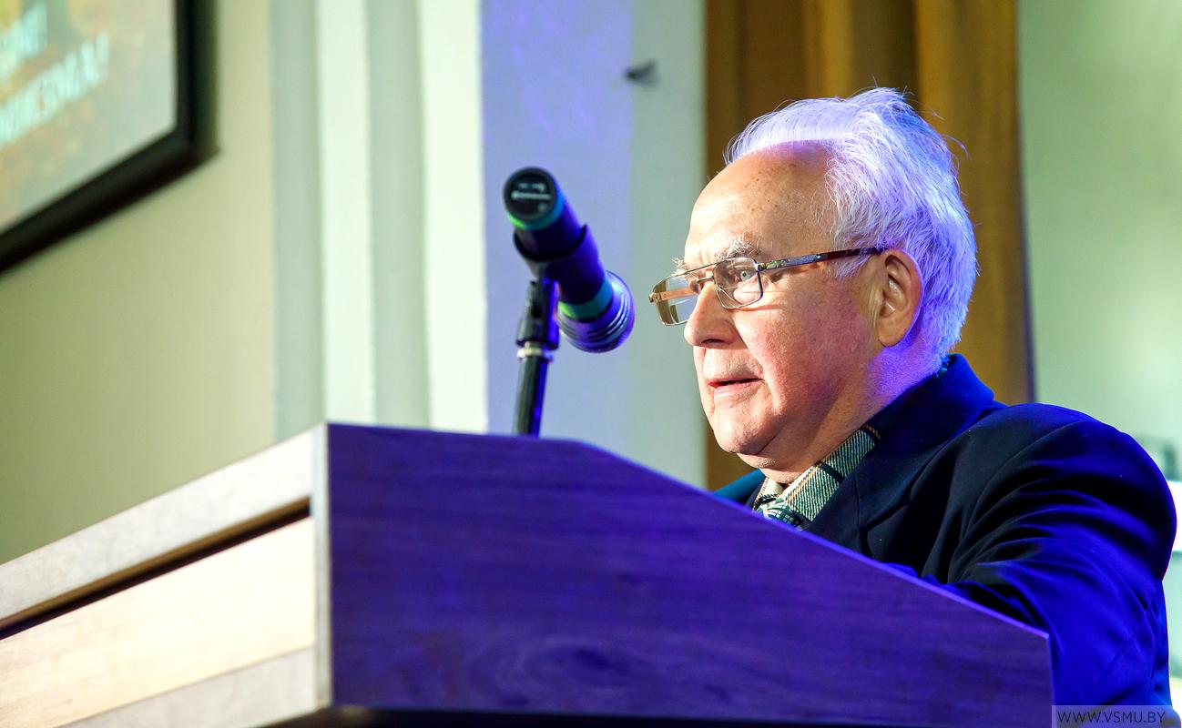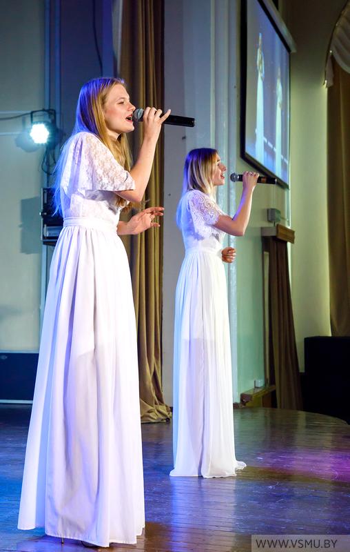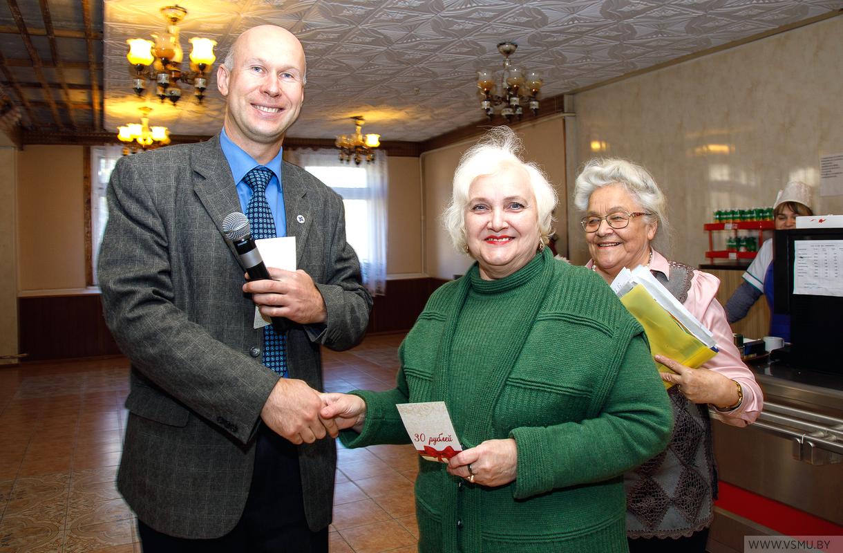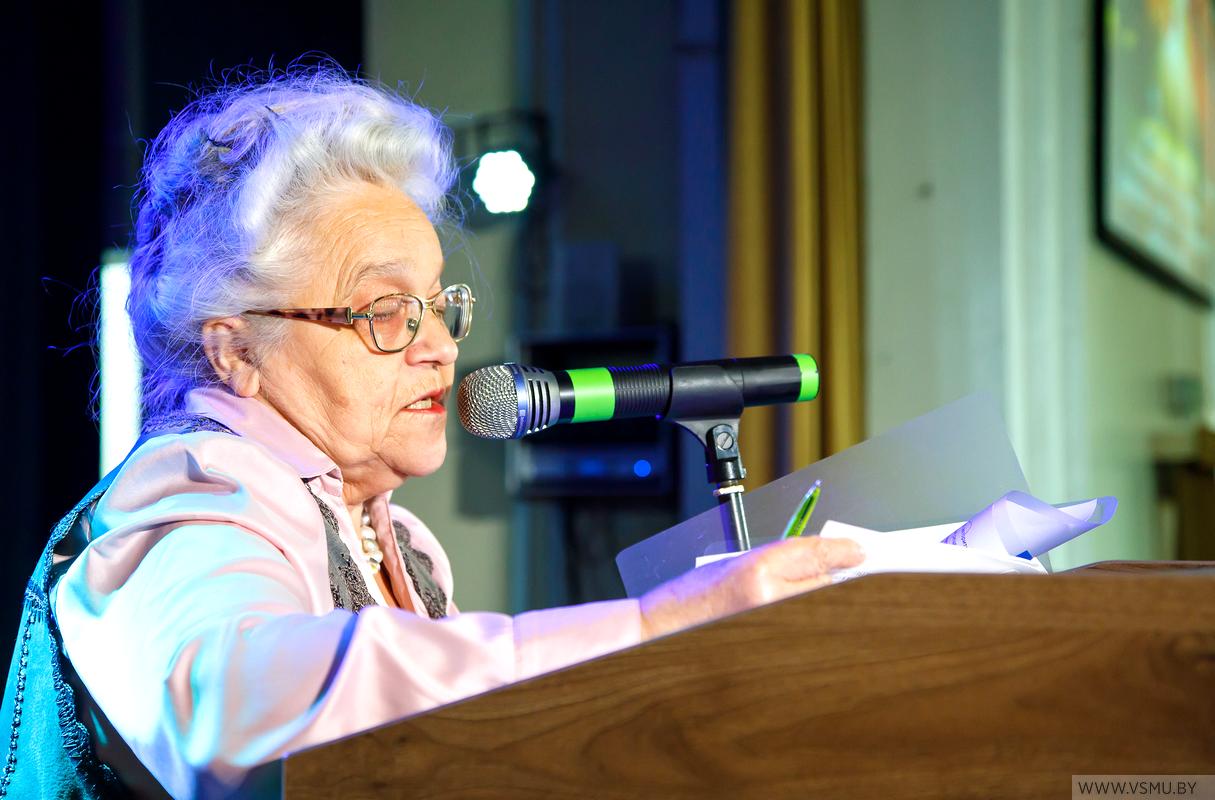 Профессор Михаил Александрович Никольский прочитал со сцены замечательные стихи, а проректор по воспитательной и идеологической работе Ольга Аркадьевна Сыродоева огласила приказ ректора университета и вручила трём нашим сотрудникам (Шибковой Валентине Владимировне, ведущему лаборанту кафедры микробиологии; Долгиной Наталье Ивановне, библиотекарю медицинской библиотеки и Адамович Ларисе Ивановне, лаборанту первой категории кафедры клинической микробиологии) удостоверения на нагрудный знак «Ветеран труда ВГМУ» за добросовестный и многолетний труд во благо развития учреждения образования «Витебский государственный ордена Дружбы народов медицинский университет».
