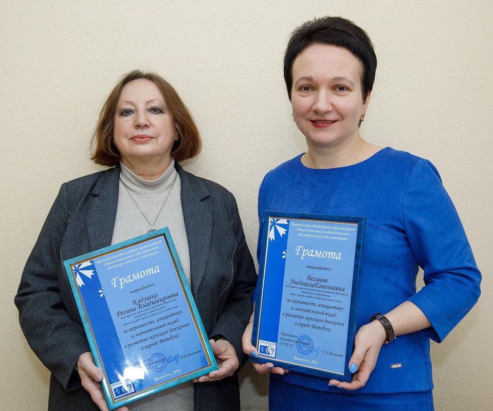 Сотрудники нашего университета Беляева Людмила Евгеньевна, заведующий кафедрой патологической физиологии, и Кадушко Регина Владимировна, заведующий кафедрой иностранных языков, были награждены Грамотами областной организации общественного объединения «Белорусский союз женщин». Искренне поздравляем и желаем дальнейших успехов!