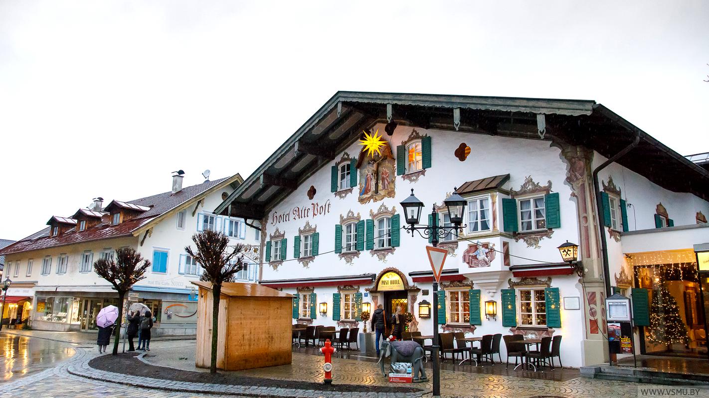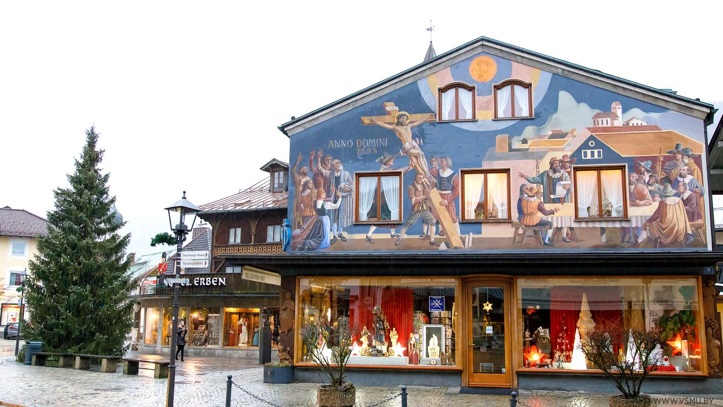 На следующий день всех ожидал ещё один архитектурный шедевр – замок Нойшванштайн, расположенный на одном из крутых утёсов Баварских Альп, у подножия которого раскинулось сказочной красоты озеро с изумрудной по цвету водой. И в этот же день вечером мы из одной сказки попали в другую – в деревушку Обераммергау, которая славится на весь мир искусством художественной росписи фасадов домов, в основном на библейские сюжеты.