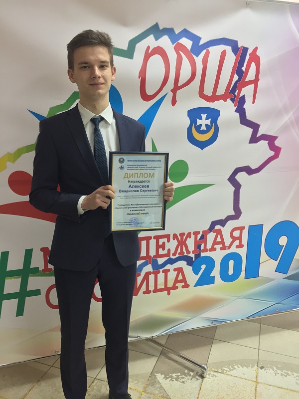 На церемонии открытия республиканского праздника, которая уже завершилась, студент 4 курса лечебного факультета ВГМУ Алексеев Владислав был награжден дипломом победителя республиканского конкурса социальной рекламы «Молодежный взгляд» в номинации «Социальный плакат». Диплом и подарок Владиславу на сцене вручил Министр образования Республики Беларусь И.В. Карпенко.