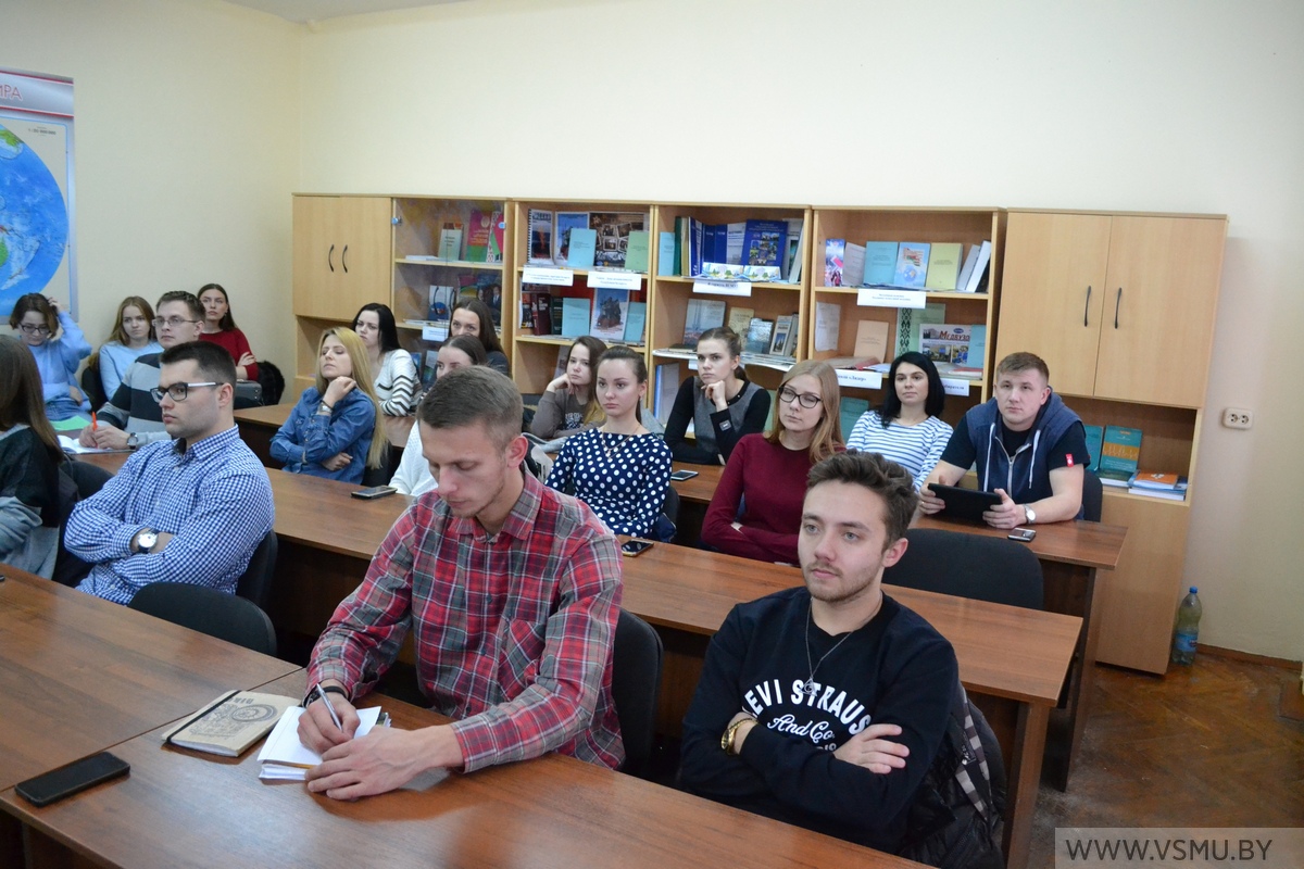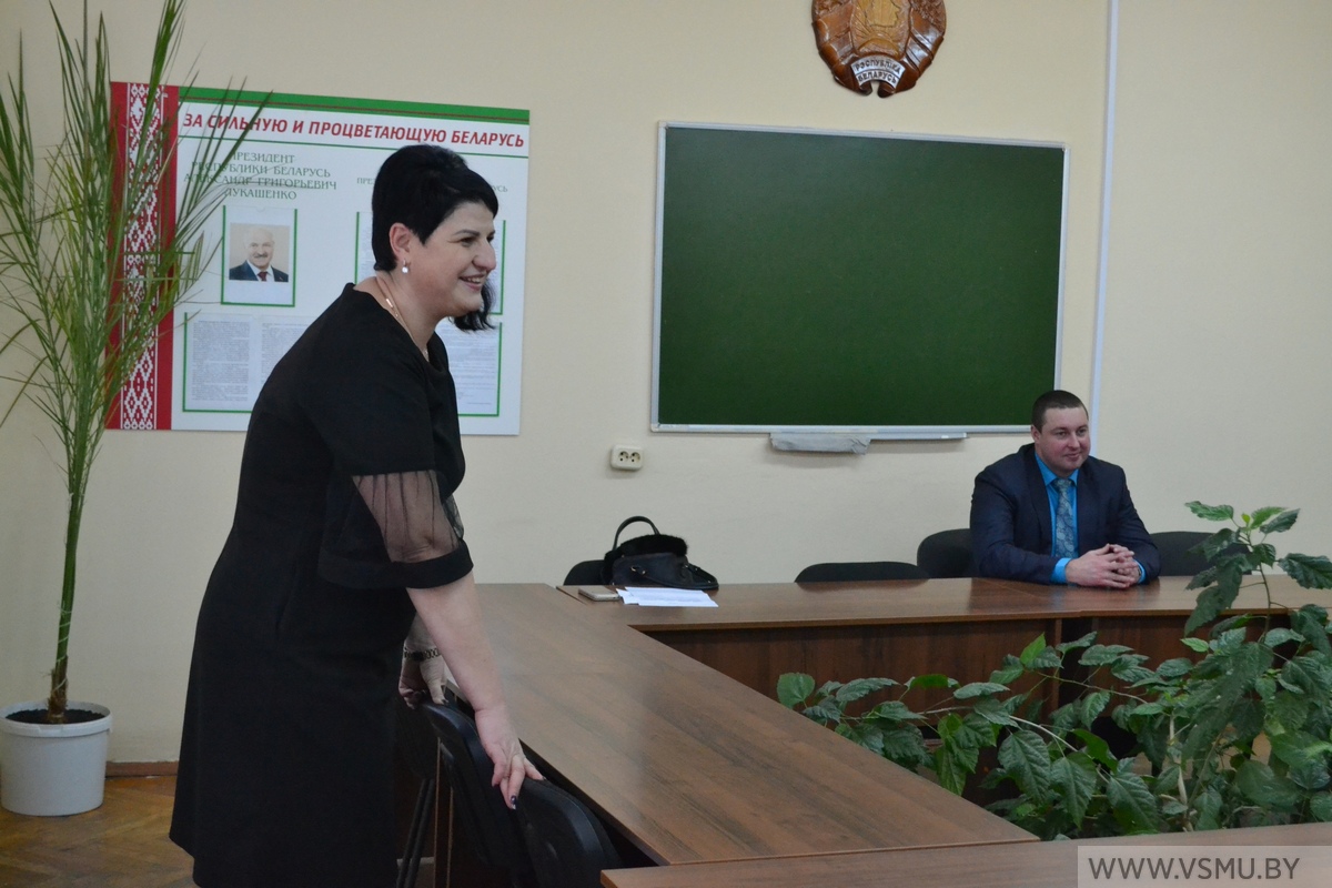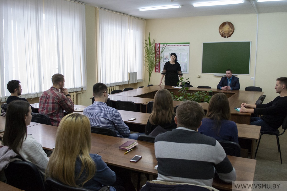 12 марта 2019 года в идеологическом центре ВГМУ состоялась встреча студентов-выпускников и студентов-активистов ВГМУ с заместителем начальника управления Департамента государственной инспекции Министерства труда и социальной защиты Республики Беларусь, начальником отдела надзора за соблюдением законодательства о труде Венетой Николаевной Синицкой по вопросам трудоустройства и нарушения трудового права.