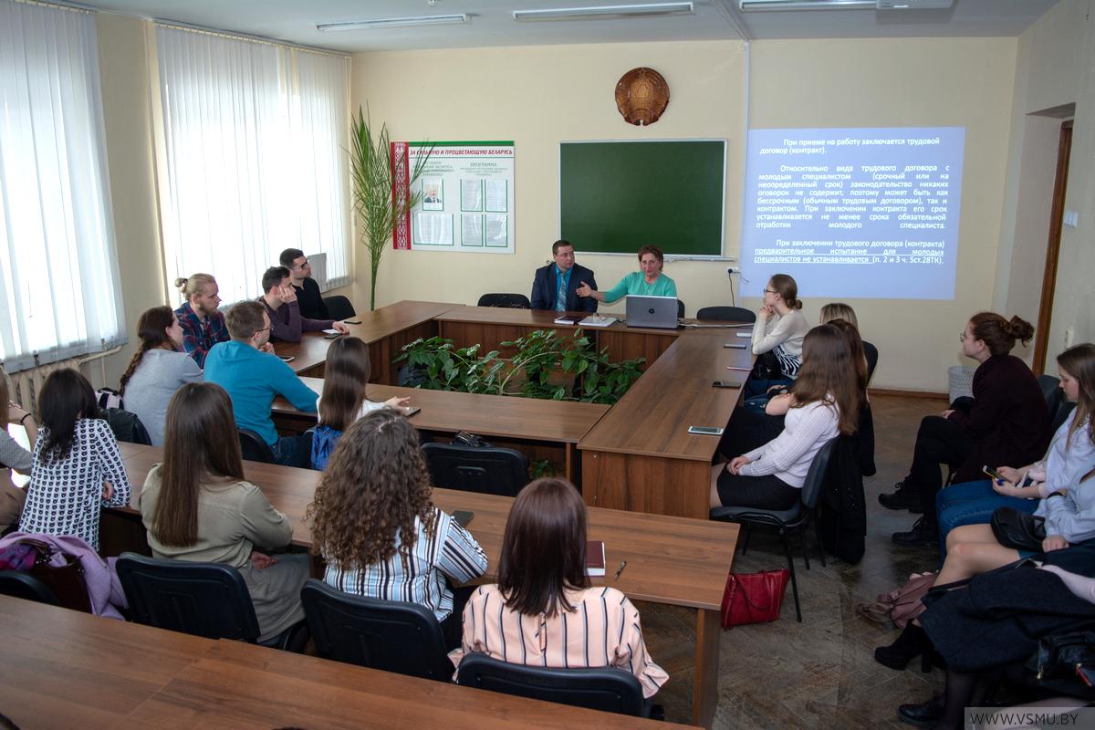 9 апреля 2019 года в рамках Школы подготовки молодежных профсоюзных кадров «Стратегический резерв 2020» в профкоме студентов состоялась встреча студентов-выпускников и студентов, работающих в учреждениях здравоохранения города Витебска с правовым инспектором труда Витебского областного комитета Белорусского профсоюза работников здравоохранения по вопросам трудоустройства и оплаты труда молодых специалистов.