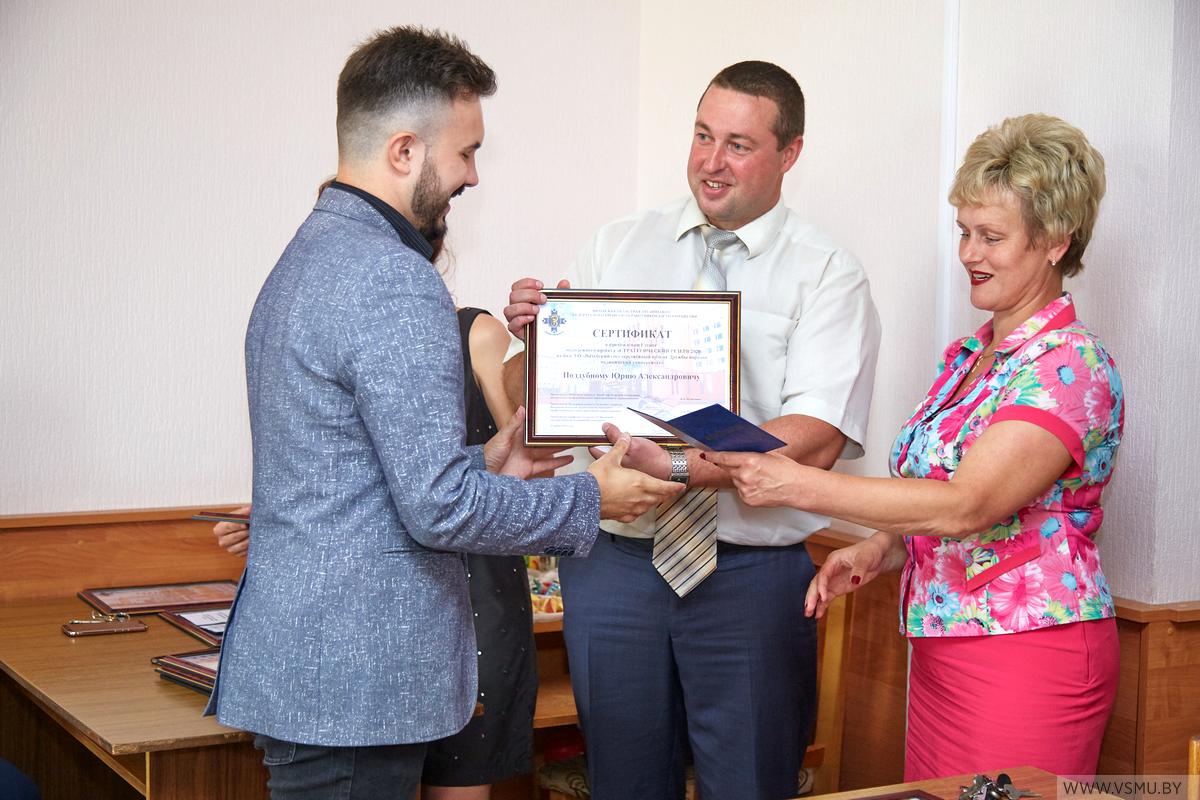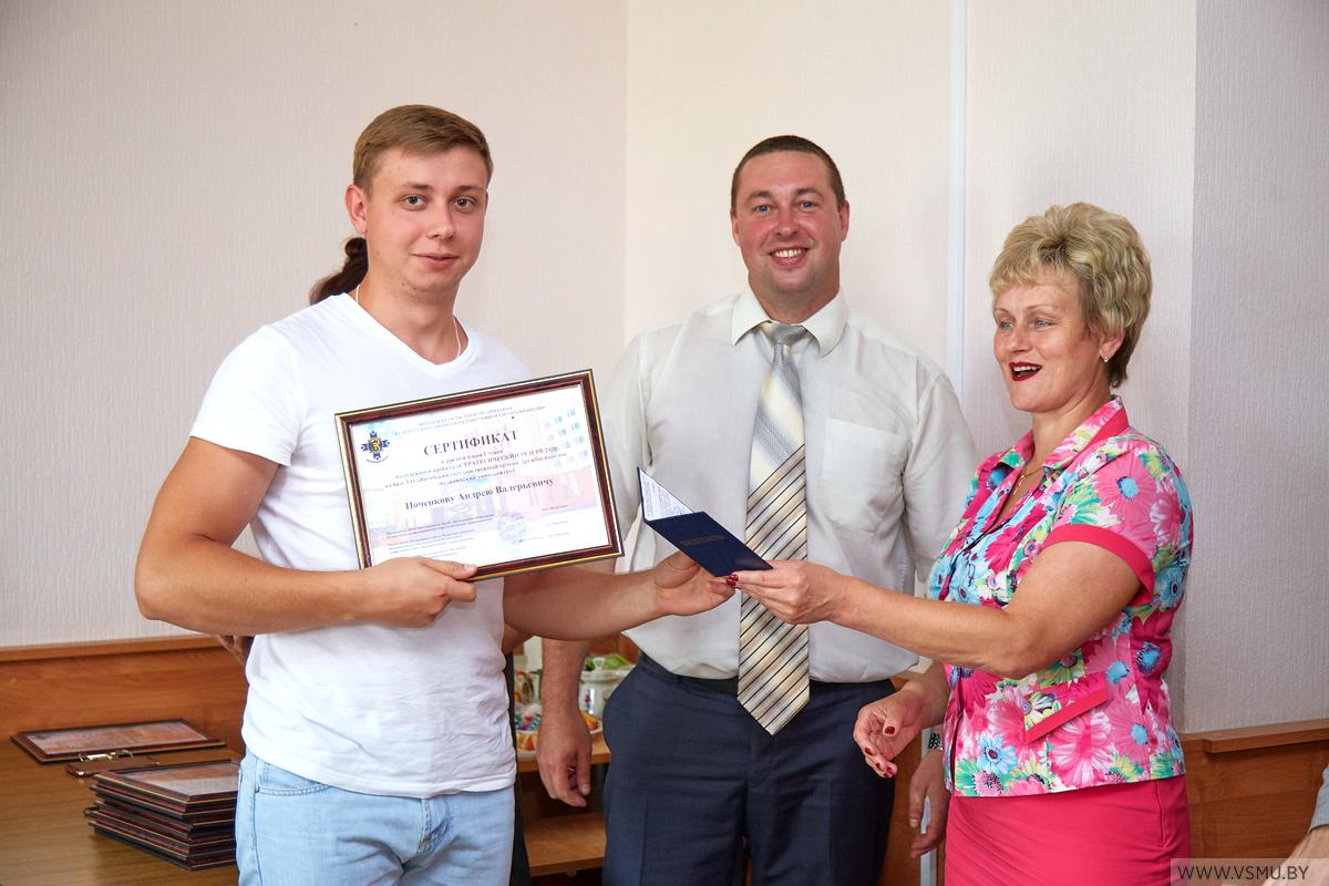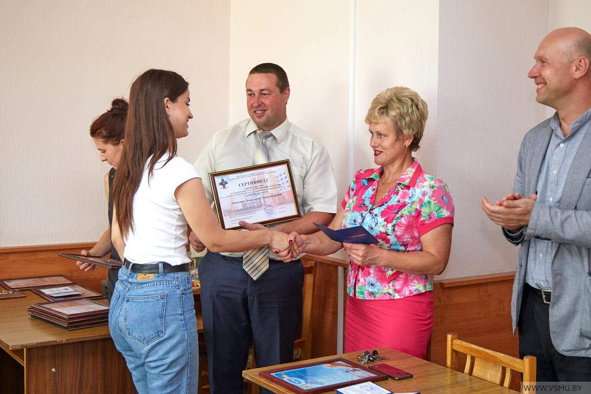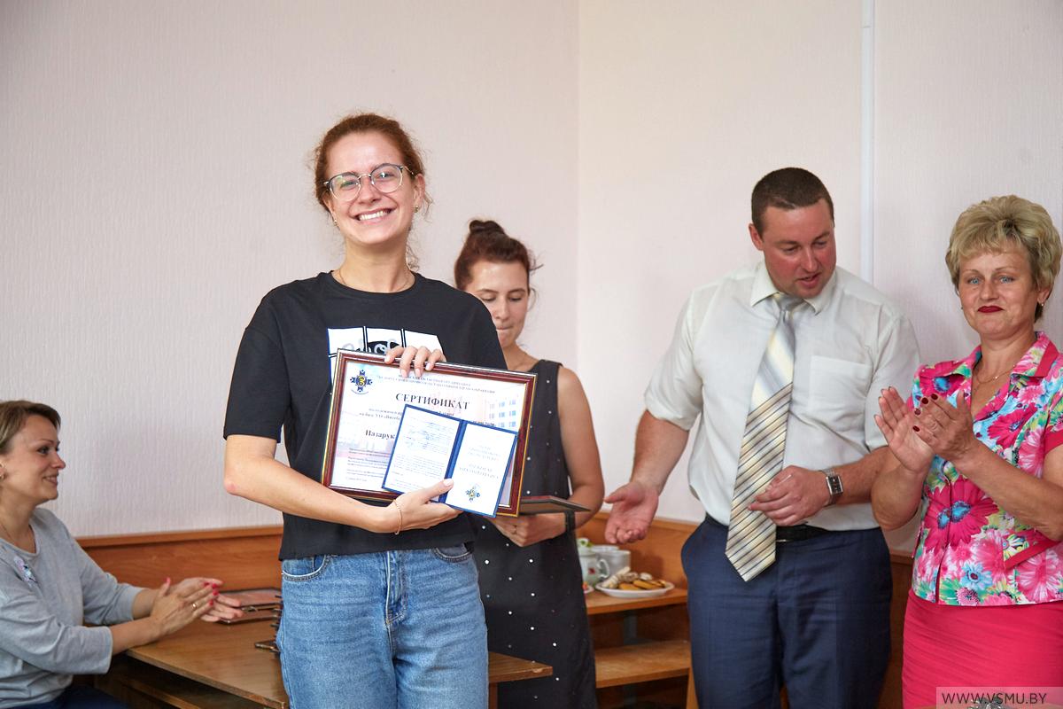 Далее в торжественной обстановке студентам-выпускникам, активистам профсоюзной работы, были вручены сертификаты и свидетельства о прохождении на базе УО «ВГМУ» I этапа молодежного проекта «Стратегический резерв 2020», а также выражены слова благодарности и признательности за годы активной работы от проректора по воспитательной и идеологической работе ВГМУ Ольги Аркадьевны Сыродоевой.