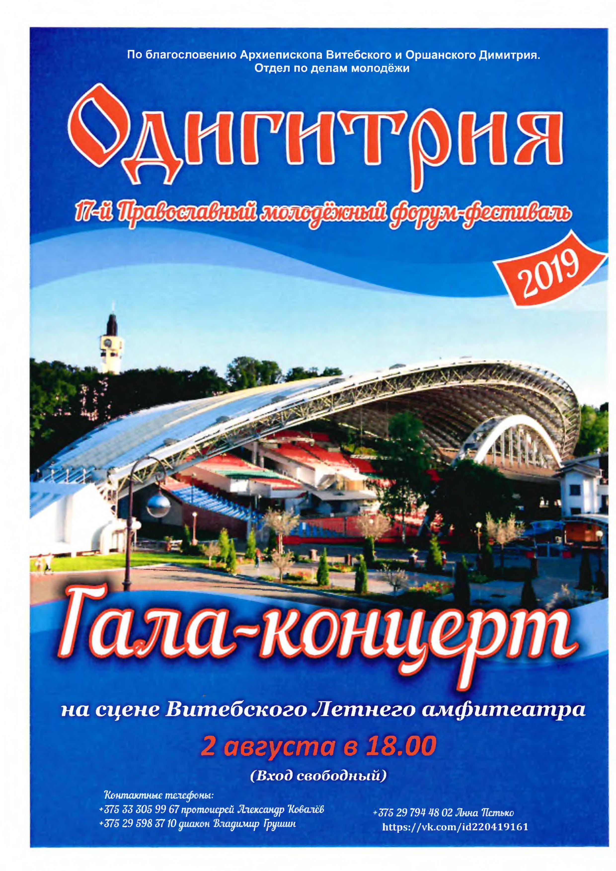Администрация Октябрьского района г.Витебска сообщает, что 2 августа 2019 года в 18.00 на сцене Летнего амфитеатра пройдет гала-концерт 17-го Православного молодежного форума-фестиваля «Одигитрия».