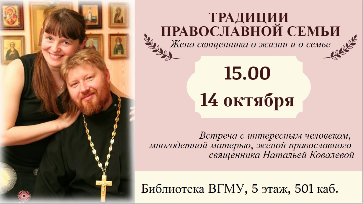 14 октября в День матери в библиотеке ВГМУ состоится встреча с интересным человеком, многодетной матерью, женой православного священника Натальей Ковалевой на тему «Традиции православной семьи».
