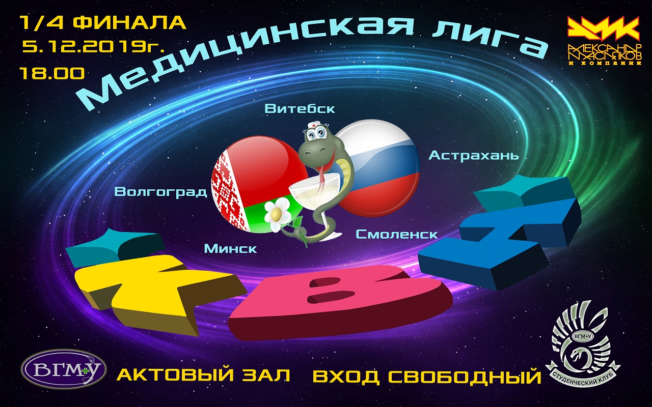 ВНИМАНИЕ!!!Медицинская лига продолжает "Праздничный сезон"! Команды КВН из медицинских вузов Минска, Смоленска, Волгограда, Витебска, Астрахани продолжат борьбу за выход полуфинал! Ждём всех совершенно бесплатно и абсолютно свободно 5 декабря 2019 года в 18.00 в актовом зале главного учебного корпуса ВГМУ по адресу г.Витебск, пр-Фрунзе, 27. Приходите - будет весело!