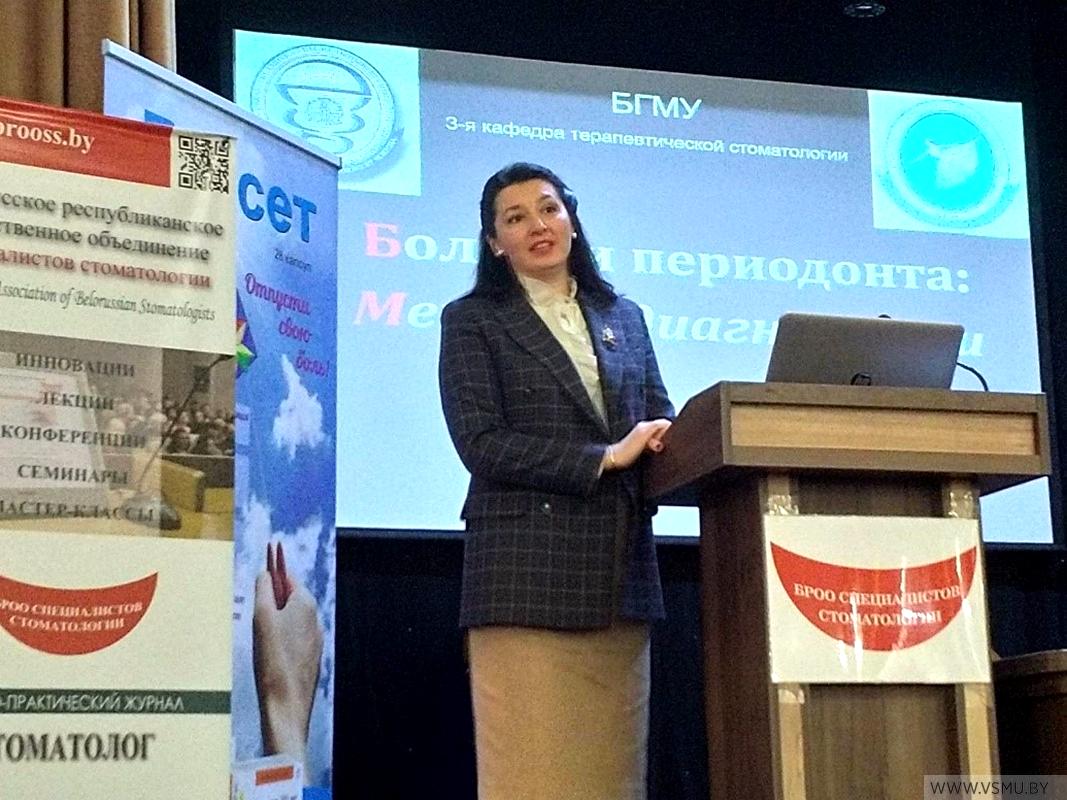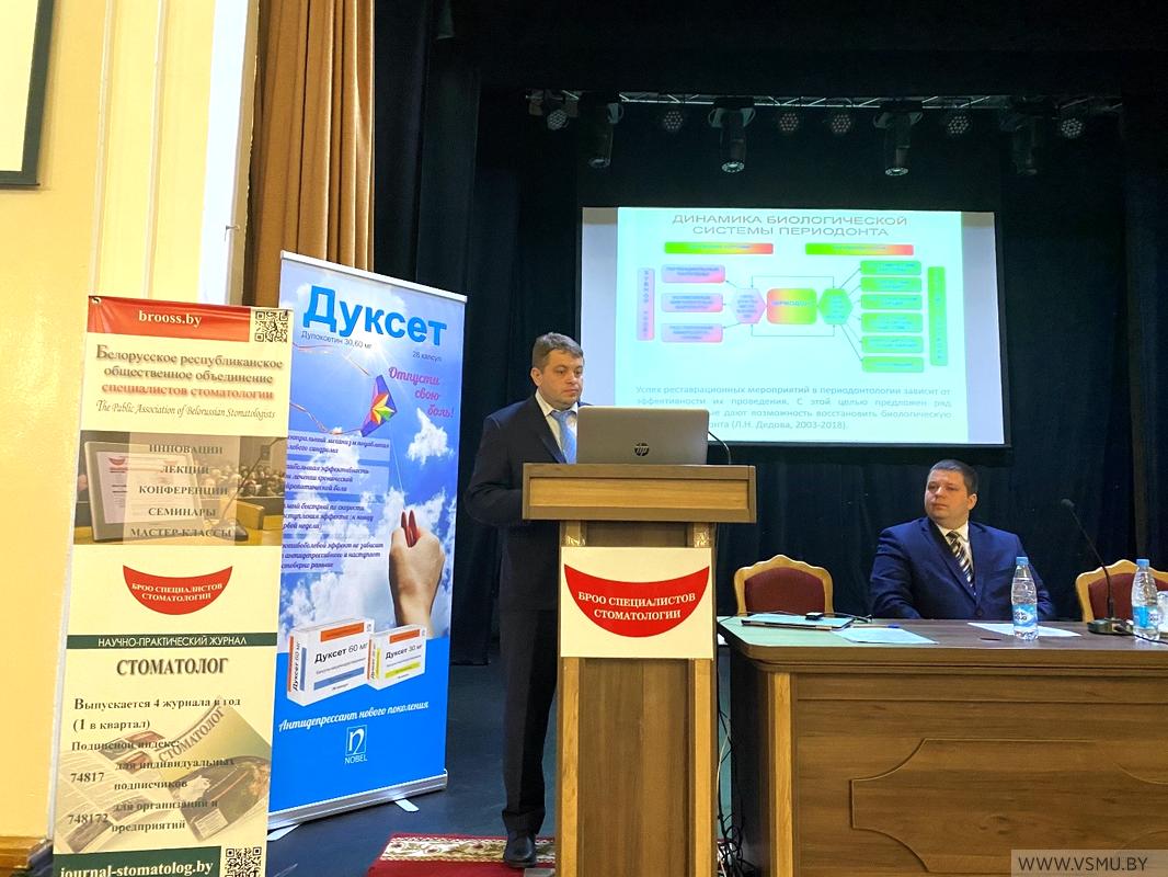 Преподаватели Белорусского государственного медицинского университета представили актуальные вопросы стоматологии: современные подходы в диагностике болезней периодонта (Денисова Ю.Л., д.м.н., проф. 3-й каф. терапевтической стоматологии), основные принципы реставрации анатомической формы зуба у пациентов с болезнями периодонта (Соломевич А.С., к.м.н., доцент 3-й каф. терапевтической стоматологии).