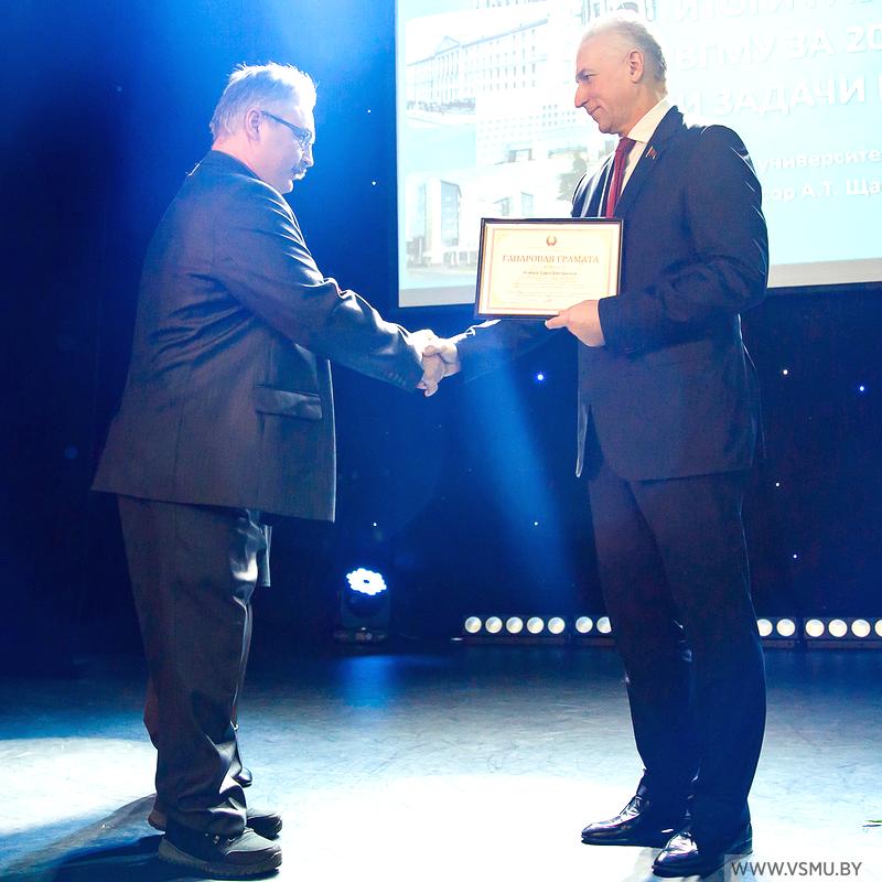 – за плодотворную научную и научно-педагогическую деятельность, значительный личный вклад в разработку приоритетных направлений медицинской науки Почетной грамотой Совета Министров Республики Беларусь награждён Петухов Владимир Иванович, заведующий кафедрой хирургии ФПК и ПК, доктор медицинских наук, доцент;