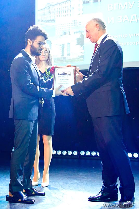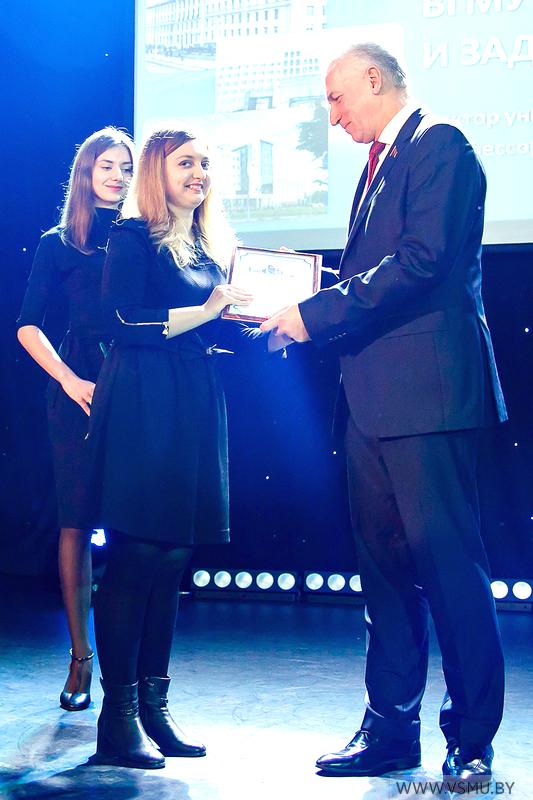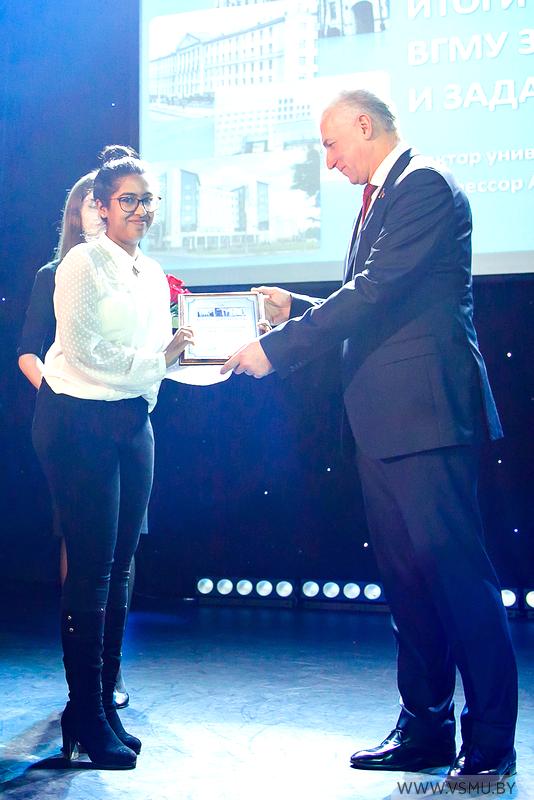 За отличную учёбу и активную общественную деятельность благодарность выражена: Новицкой Веронике Андреевне, студентке 5 курса фармацевтического факультета; Дубаневич Елене Дмитриевне, студентке 5 курса лечебного факультета; Бхатт Сушан (Индия), студенту 2 курса факультета подготовки иностранных граждан, специальность «Лечебное дело»; Хапутантри Дона Сара Розмари, студентке 6 курса факультета подготовки иностранных граждан, специальность «Лечебное дело».
