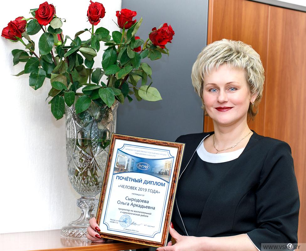 Признана победителем в номинации «Человек 2019 года» Витебского государственного ордена Дружбы народов медицинского университета за большой личный вклад в организацию и проведение общественно значимых и политических внутриуниверситетских, районных, городских, областных, республиканских мероприятий; содействие развитию международного фестивального движения студентов – медиков; победу в районном этапе областного смотра – конкурса на лучшую организацию идеологической работы в трудовых коллективах Витебской области в 2019 году Сыродоева Ольга Аркадьевна, проректор по воспитательной и идеологической работе.
