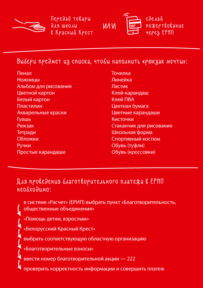 С 1 августа по 1 октября 2020 года с 09.00 до 16.00 Витебская городская организация Белорусского Общества Красного Креста (далее – БОКК) объявляет приём от организаций и физических лиц школьной одежды, обуви, книг, письменных и спортивных, канцелярских принадлежностей, учебных пособий по адресу: г. Витебск, ул. «Правды», 43 (территория средней школы № 28), тел. 24 64 81, e-mail: Адрес электронной почты защищен от спам-ботов. Для просмотра адреса в вашем браузере должен быть включен Javascript..