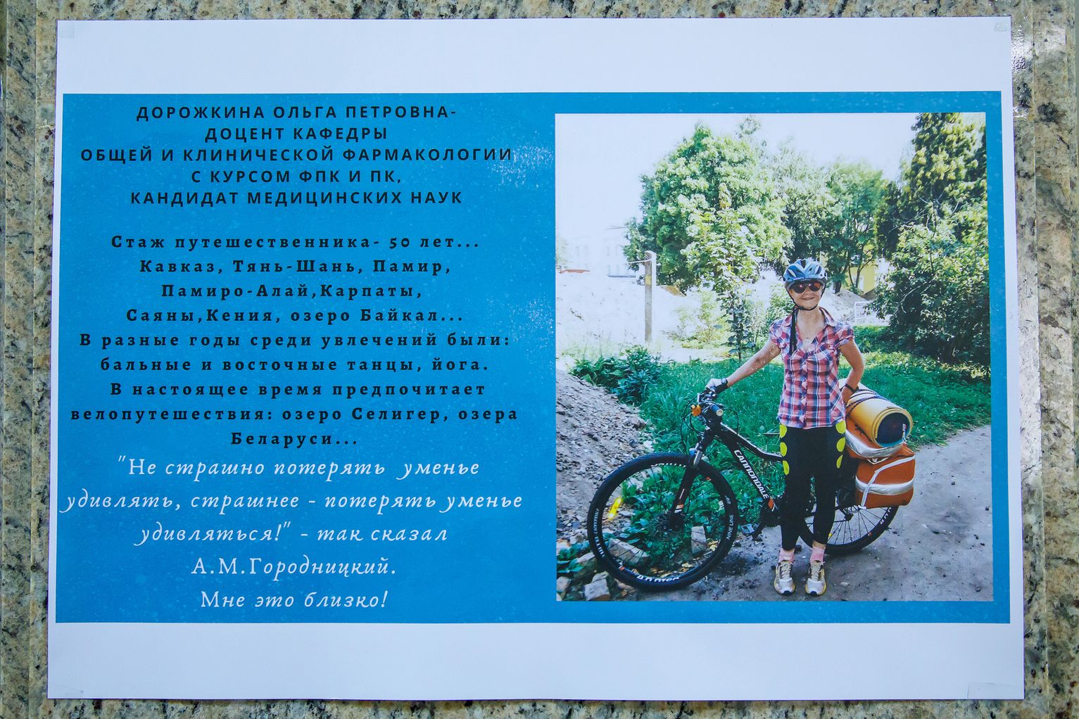 Более 50 лет Ольга Петровна занимается туризмом. Она прошла путь от хрупкой девушки с рюкзаком-монстром, которого называли «Василием», до опытного путешественника, объездившего горы, озера и долины, как Беларуси, так и зарубежья. На выставке автор поделилась историями некоторых работ, а ее соратники в туристическом деле, уже выставлявшие свои работы в нашей библиотеке, делились воспоминаниями и желали автору продолжения творческого фотопути. Доцент кафедры неврологии и нейрохирургии к.м.н. Пашков Александр Александрович с улыбкой вспоминал их первый поход в Браславе, где был руководителем туристической группы, и что это, пожалуй, был самый «водный» поход, когда вода выливалась на них дождями и окружала вокруг. Профессор кафедры факультетской хирургии д.м.н. Фомин Анатолий Викторович поблагодарил библиотеку и Красикову Елену Григорьевну, в частности, за прекрасное начинание, позволяющее показать сотрудников ВУЗа с другой, творческой стороны. На открытии была даже выдвинута идея о создании фотобанка работ сотрудников вуза в электронном виде, и даже о дарении работ библиотеке.