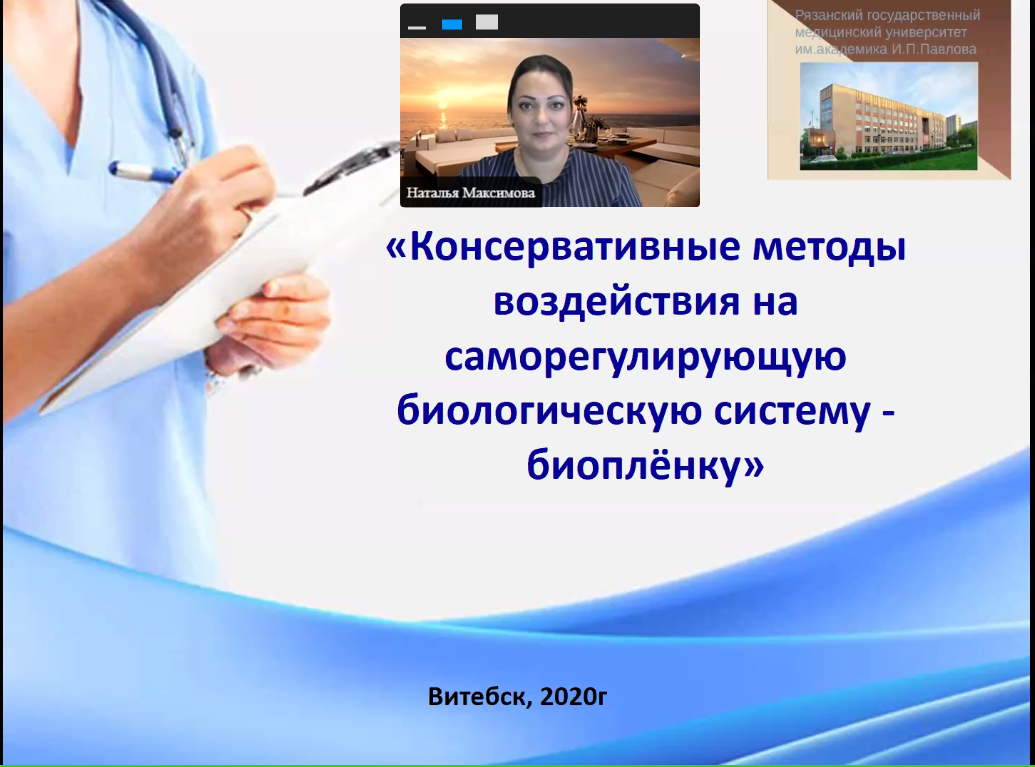 28 октября 2020 г. в рамках ХХ международной конференции студентов и молодых ученых «Студенческая медицинская наука XXI века» состоялась онлайн-лекция кандидата медицинских наук, доцента кафедры хирургической стоматологии Рязанского государственного медицинского университета Натальи Владимировны Максимовой, посвященная консервативным методам воздействия на микробную биопленку в периодонтологии.