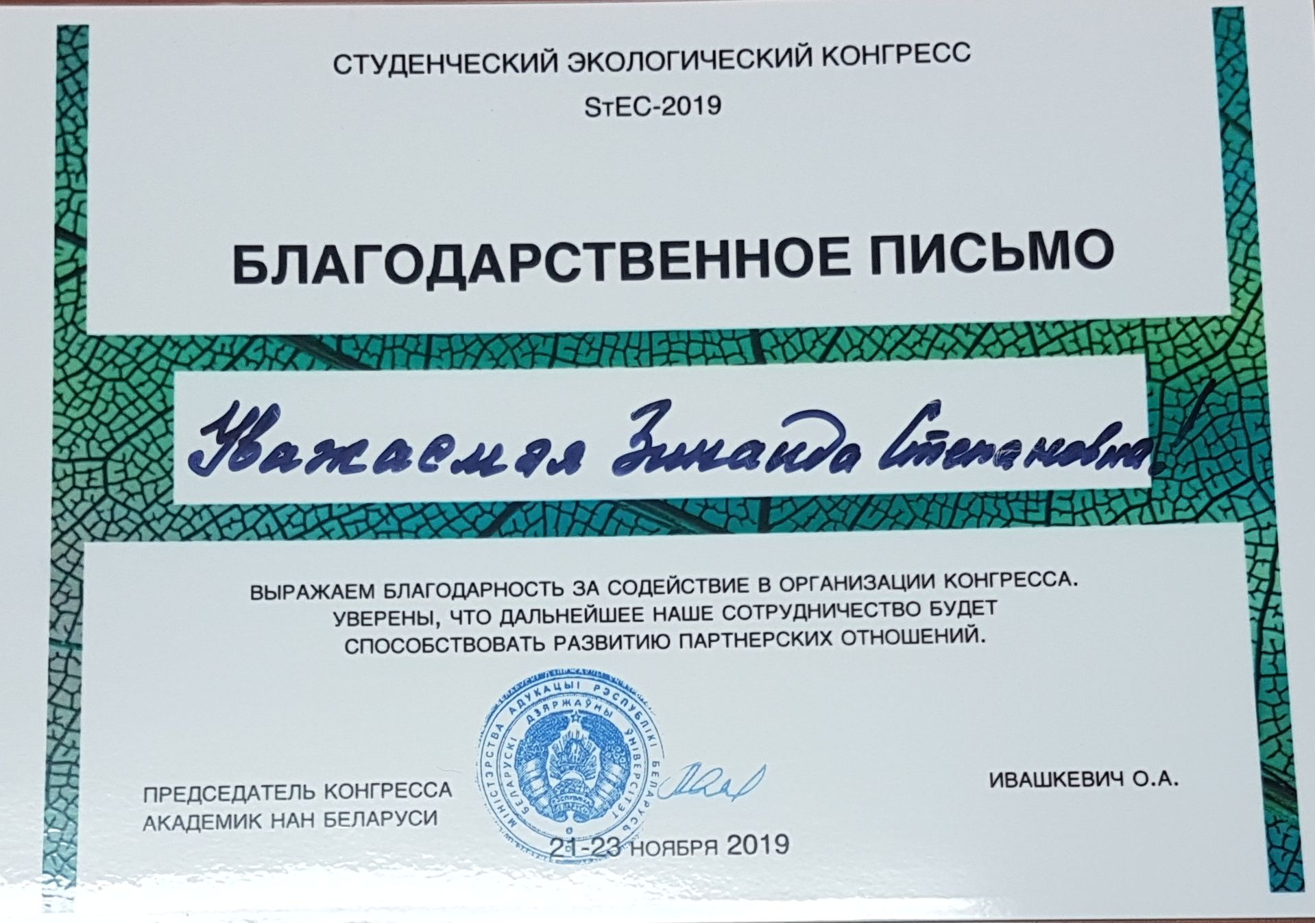 Химический факультет БГУ выражает огромную благодарность ректору нашего университета, профессору А.Т.Щастному, за участие студентов ВГМУ в работе 3-ого Международного студенческого экологического конгресса StEC-2020, за создание в университете условий для проведения студентами научных исследований.