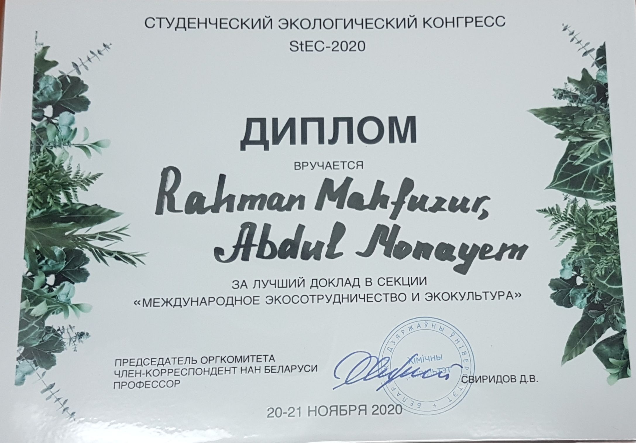 Студенты ВГМУ – члены студенческого научного кружка кафедры общей, физической и коллоидной химии: Абдул Монайем, Рахман Махфузур, Мукеленге Бафакулера Розине, приняли участие в работе 3-ого Международного студенческого экологического конгресса StEC-2020 (20-21 ноября 2020 г.), организаторами которого являются химический кластер БГУ и студенческий проект «Виртуозы науки БГУ».