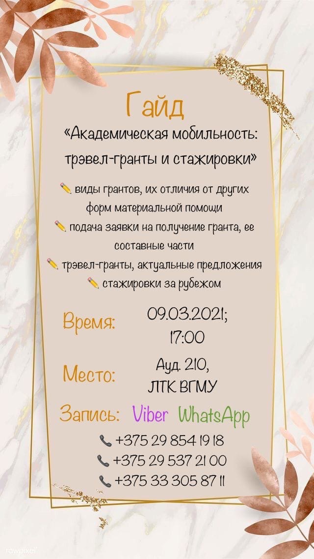 9 марта 2021 года Совет студентов ВГМУ провел встречу «Академическая мобильность: трэвел-гранты и стажировки» в рамках курса «Стажировки за рубежом». Данное направление работы Совета курирует студентка 5 курса лечебного факультета Валентина Перепелица.